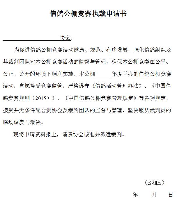 (一)《信鸽公棚竞赛裁判申请书》(附件2);
