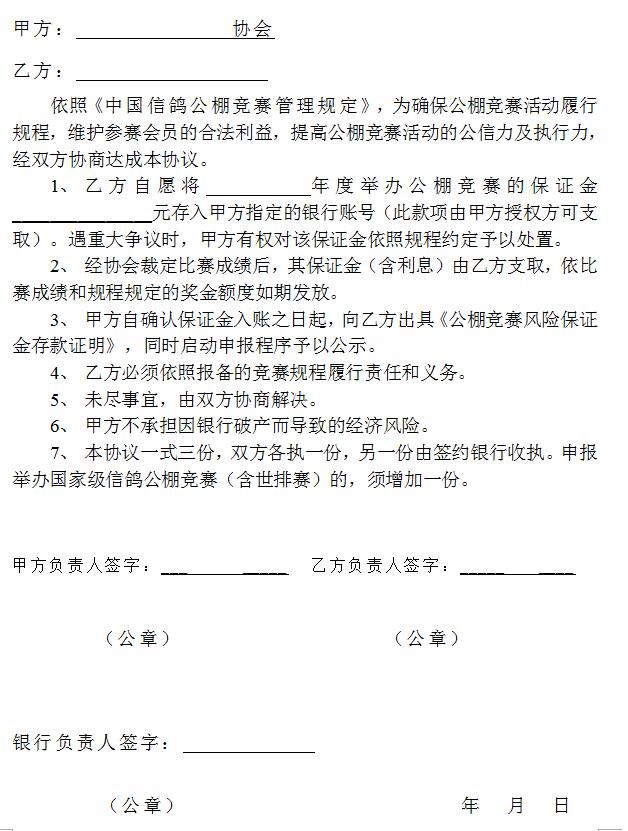 (七)协会、办赛单位、银行三方签署的《公棚竞赛风险保证金协议》(附件5)。