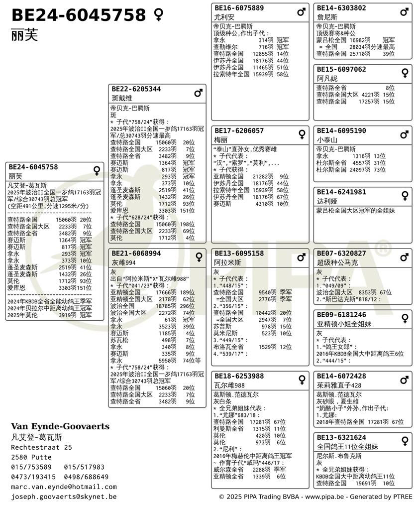 2025年赛绩:获得2025年比利时波治Ⅱ国家赛一岁鸽组全国冠军。