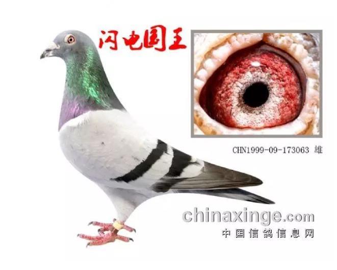 闪电国王,中国上海知名养鸽家、上海特比环传奇教头——石明先生的镇棚种鸽。该鸽生于1999年,桑杰士血统。从其出生,即宝刀配英雄,与石明先生相得益彰,共同缔造石明鸽舍六代实战冠军实战系,一直良好发挥至今。不过,世间终无不散之宴席,该鸽已于2017年9月14日寿终正寝,令人扼腕。