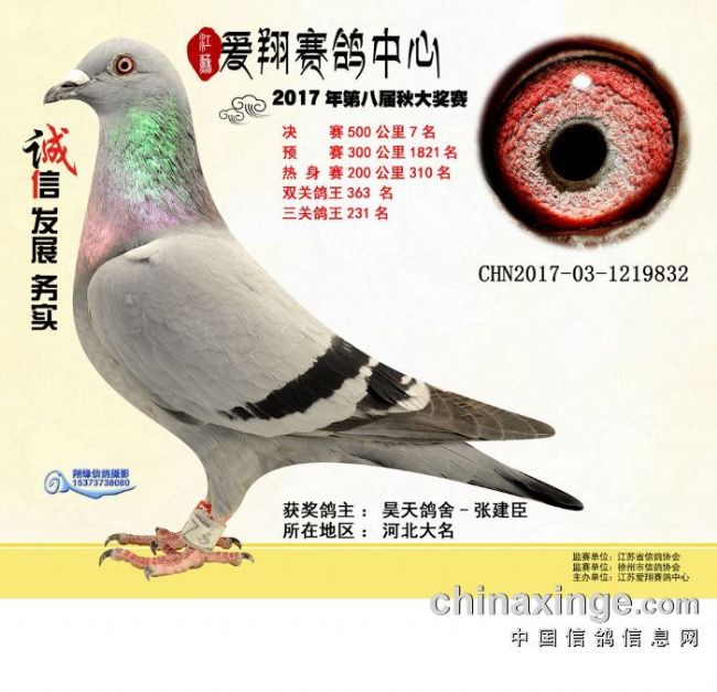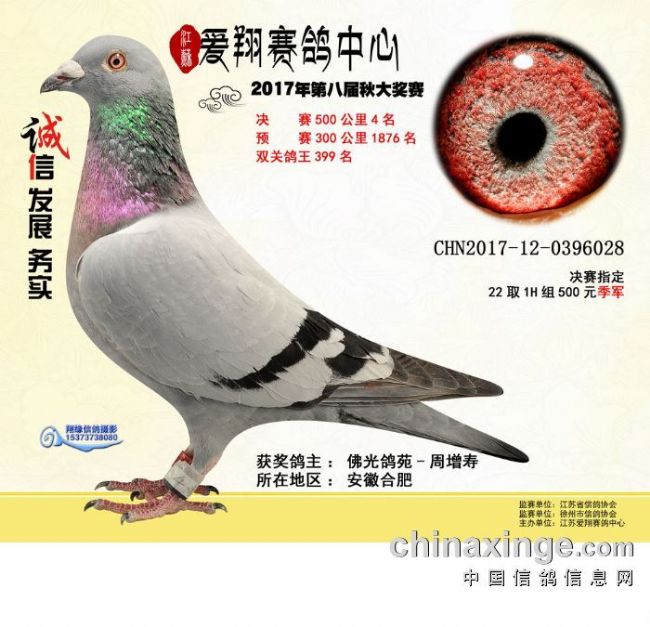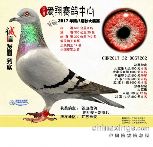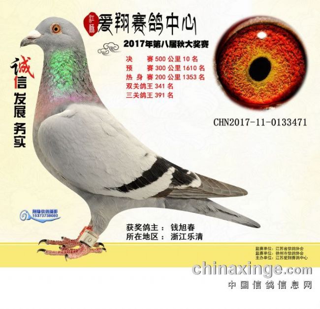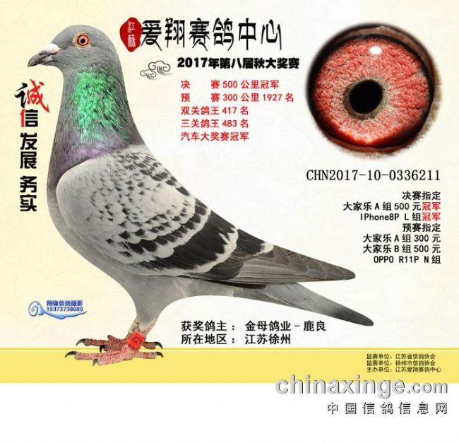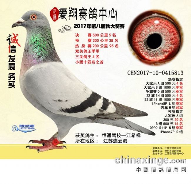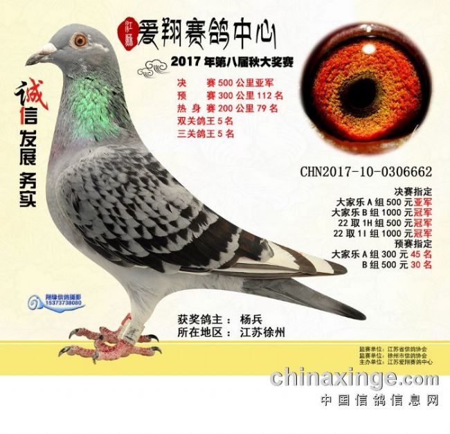收鸽 8858羽 清棚 80公里 6863羽 2017-09-29 10:04:21 1255.9614 5936羽 6280羽 热身 200公里 5530羽 2017-10-26 13:19:28 925.8719 1130羽 2588羽 预赛 300公里 2588羽 2017-11-02 12:39:48 1131.8265 1296羽 2353羽 决赛 500公里 2353羽 2017-11-12 14:21:46 1200.1498 451羽 1685羽 加站 500公里 1254羽 2017-11-19 13:52:55 1169.1254 113羽 757羽