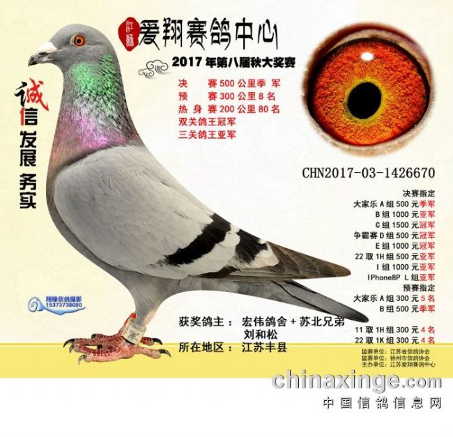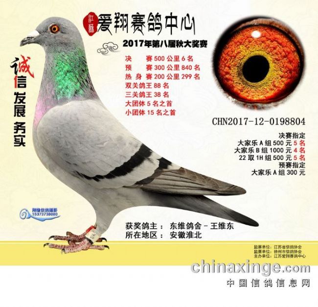 拍卖时间:2017年12月7-8日 拍卖地点:江苏省徐州市火车站右手徐州饭店五楼 联系电话:13337958828 拍卖方式:网络拍卖+现场拍卖+现场视频直播 媒体支持:中国信鸽信息网 拍卖顺序:12月7日:加站赛100-1名、600-2名的双名次 12月8日:600-1名的单名次