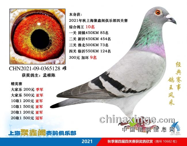 2021年第四届秋季四关鸽王赛,分为450、450、500、550公里四关赛,设有200元组、300元加环、1000元加环三项赛事,后者包含前者。200名组总计售环10682枚,录取名次为624名;300元加环总计售出3070枚,录取186名;1000元加环售出520枚,录取16名。同时,聚鑫阁与上海市信鸽协会联动,今年四关赛综合151名起至最后归巢的赛鸽,可参加市年度总决赛暨幼鸽排名赛。俱乐部额外拿出10万元加奖入围市总排名前200名的获奖专环赛鸽,并进行五关综合鸽王赛,赢得了参赛鸽友的点赞和支持。
