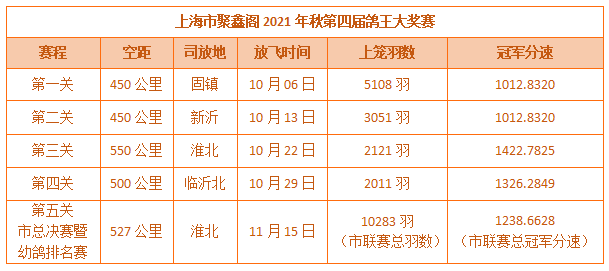上海聚鑫阁2021年幼鸽排名赛五关鸽王49羽