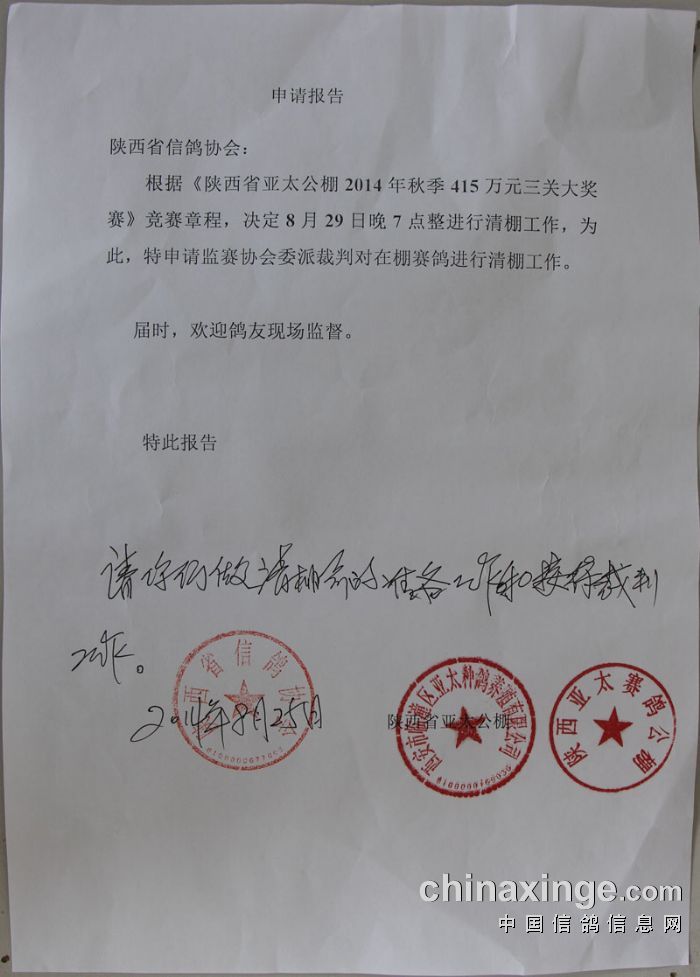 陕西亚太赛鸽公棚秋季第一届2014年415万元三关赛清棚时间定于8月29日19:00时进行,如有延期则另行通知。