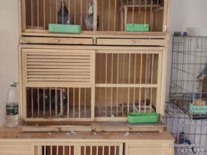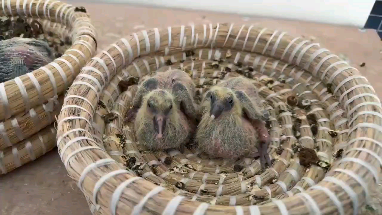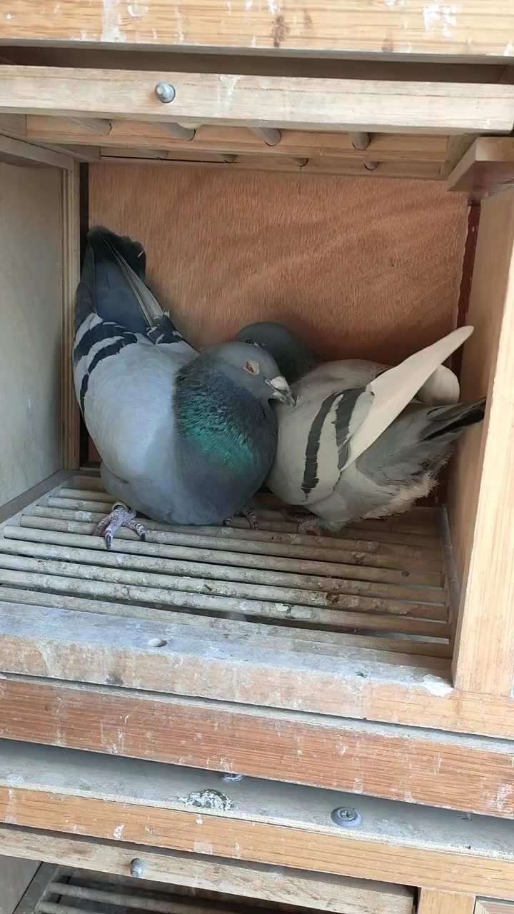超霸952灰白条黄眼雄配雨点砂眼雌435,第一窝小鸽子才23日龄,昨天下午又产下第二窝首枚蛋。第一窝小鸽子两羽都有白条,灰白条环号151像雌,雨白条环号152是雄,暂时看着两只小鸽子长的还算满意。