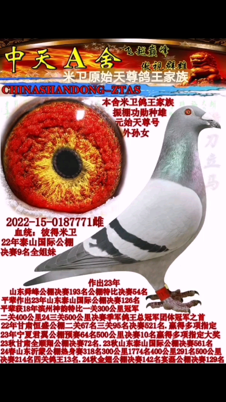 本舍彼得米卫鸽王家族原始天尊号代表直孙女.作出山东舜峰公棚决赛193名,公棚特比环决赛54名。全姐妹泰山公棚决赛9名。