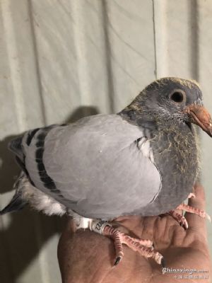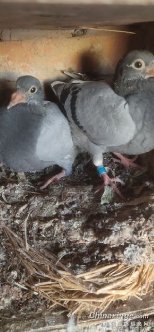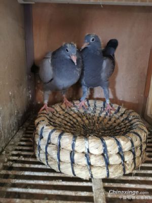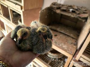 3月22日出壳,今天拿下楼开始手养,(4月7日)18天大。雄鸽子是羽纯白色的,雌鸽子是羽小体型纯黑色的鸽子。