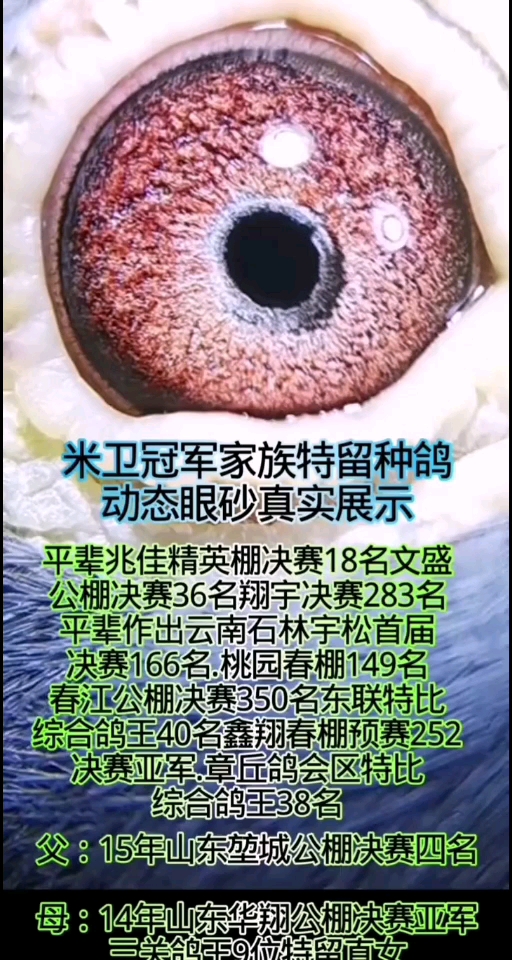 本舍彼得米卫冠军家族特留种鸽眼砂动态真实展示。本身是堃城公棚决赛4名直女,又是德州天翼公棚决赛总冠军孙女,还是华翔公棚决赛亚军外孙女。集本舍红色,灰色,黑色,三大米卫主血高位基因于一身。