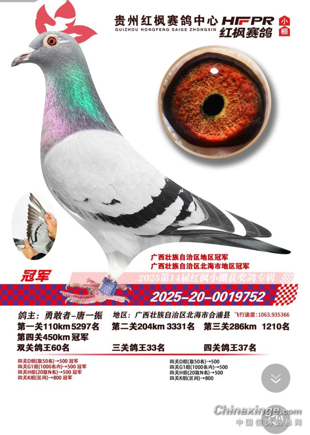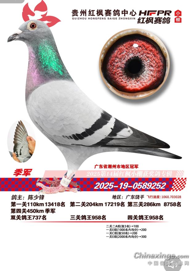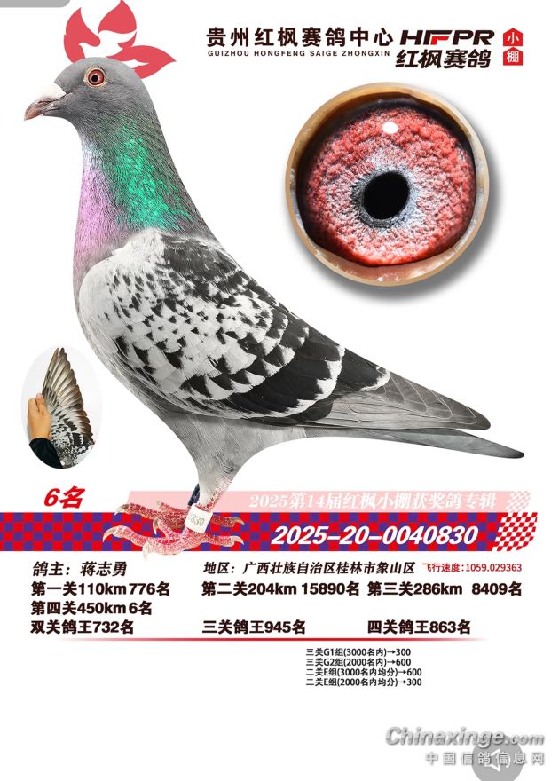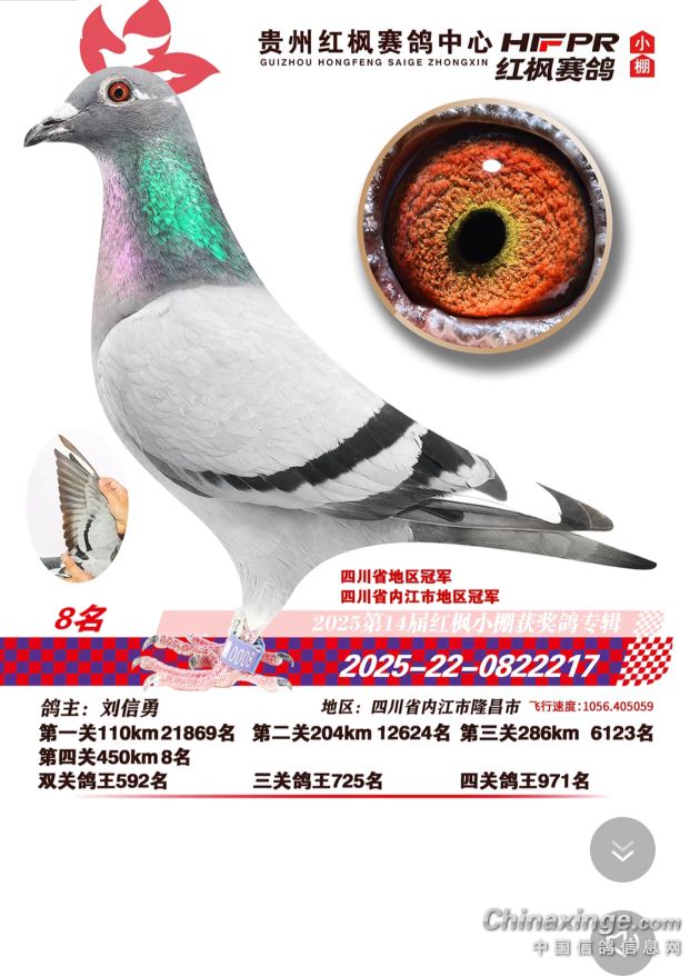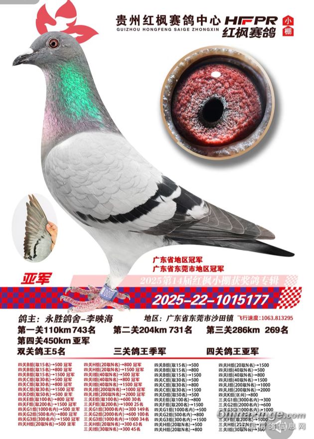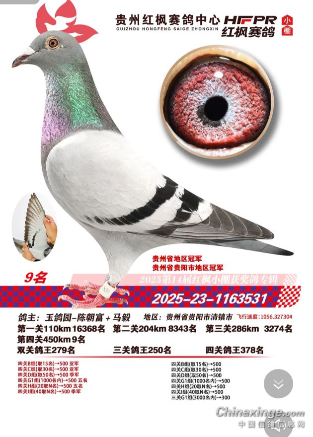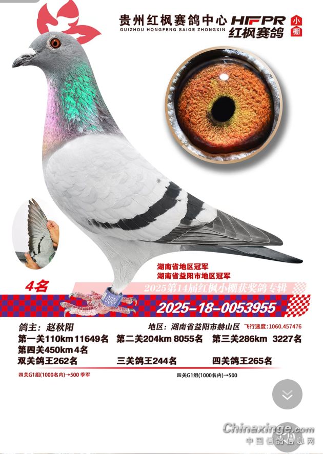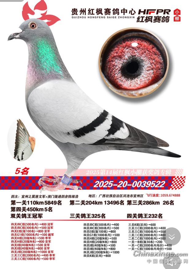 2023年秋季第一关上笼2205羽,有效归巢956羽,归巢率43.45%。第二关上笼912羽,有效归巢464羽,归巢率50.88%。获得双关综合成绩前20名如下: