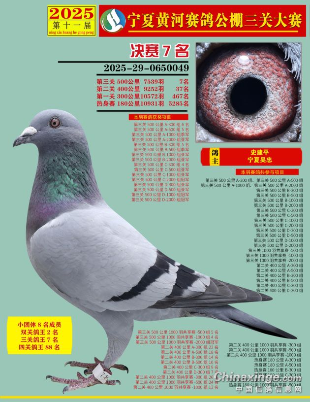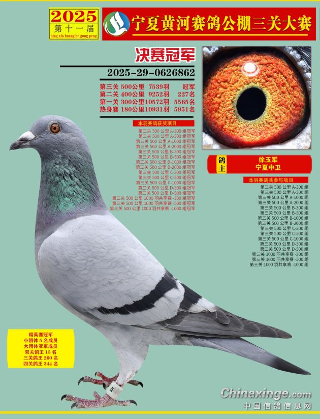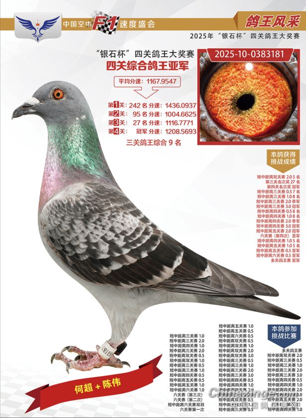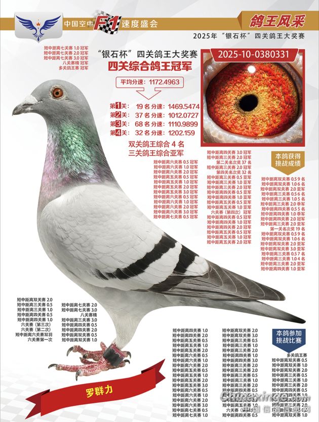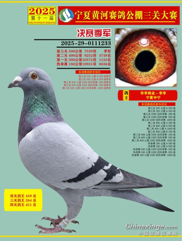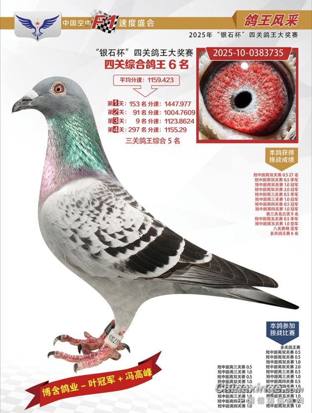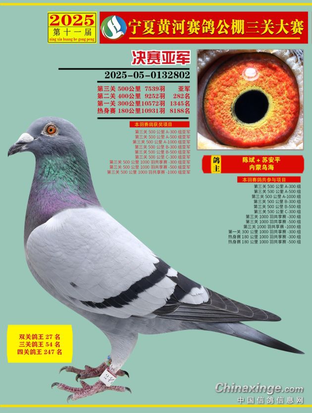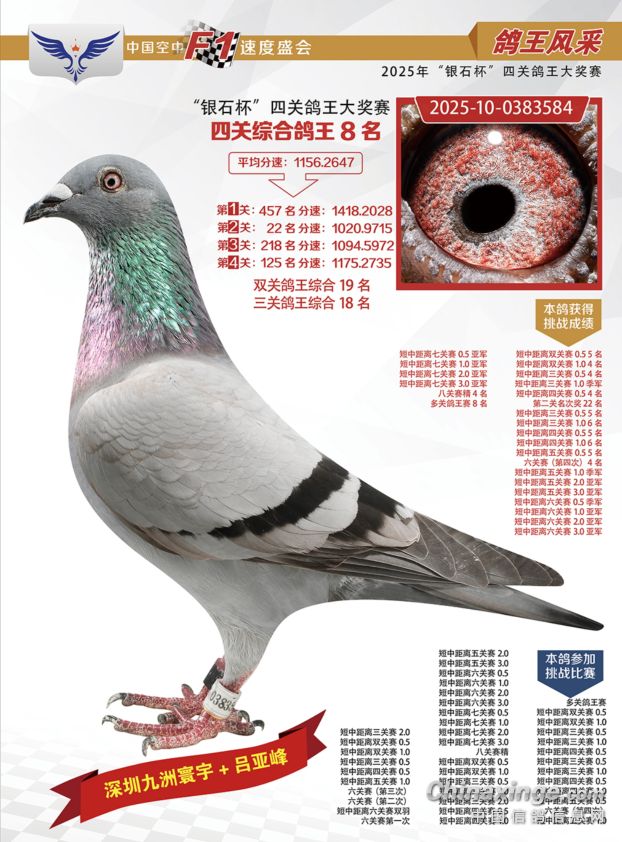 秋赛,亮剑! •  江苏启东银石赛鸽俱乐部2025年“银石杯”四关鸽王大奖赛前九位欣赏。四关鸽王冠军还获得短中距离赛24项冠军、12项亚军、2项季军,成为最大赢家。