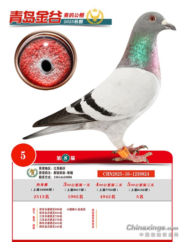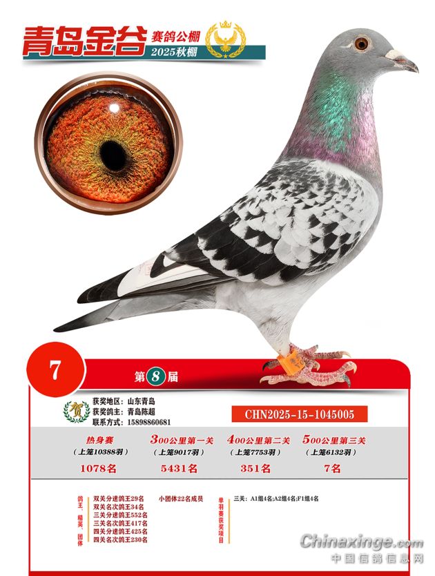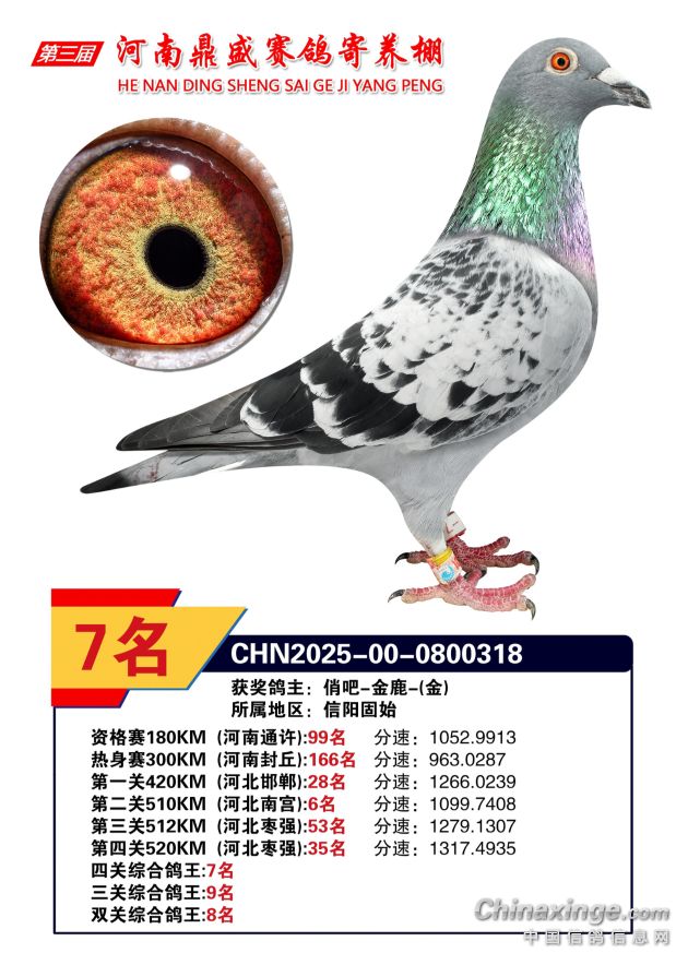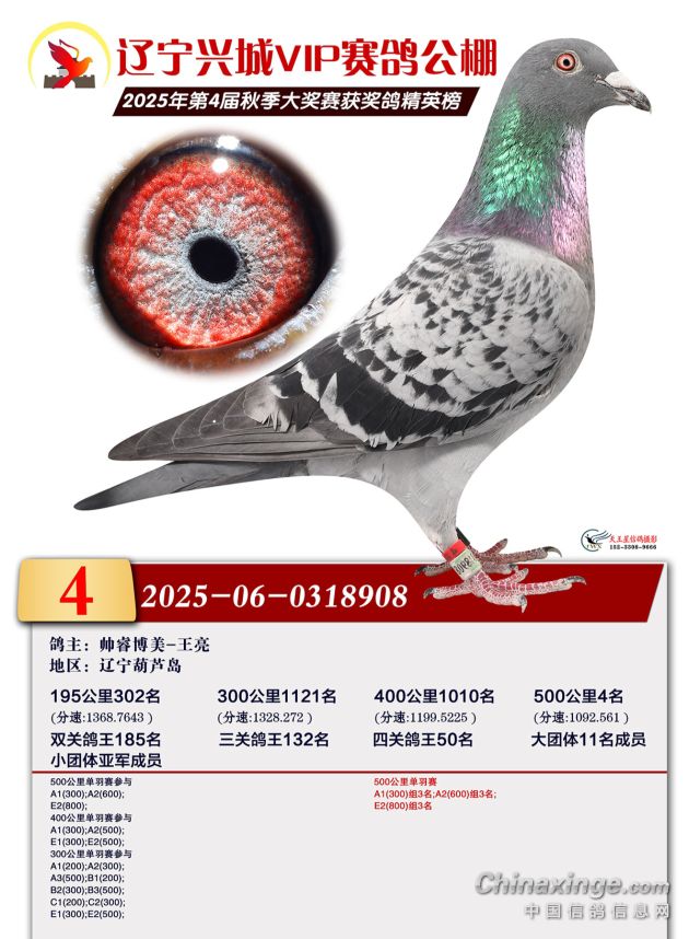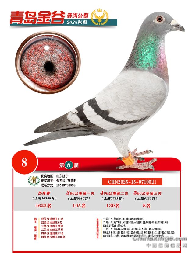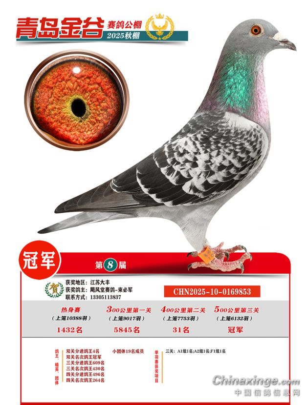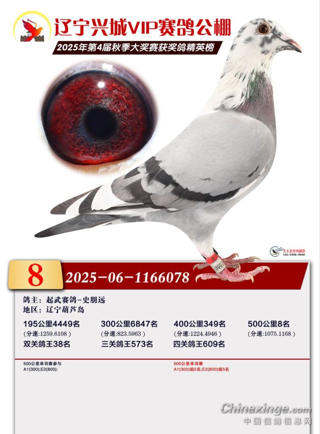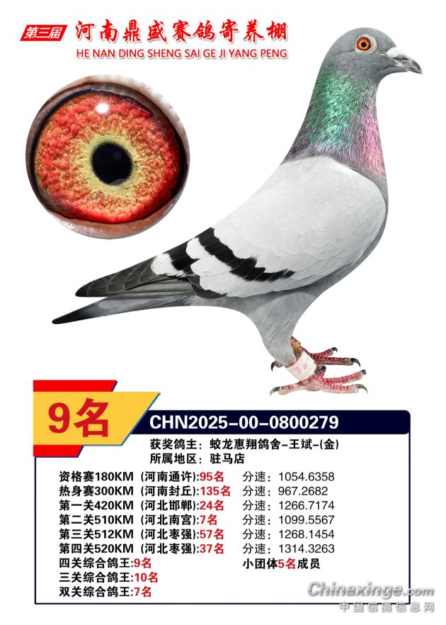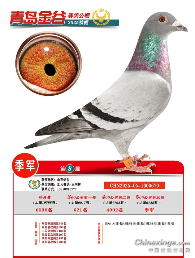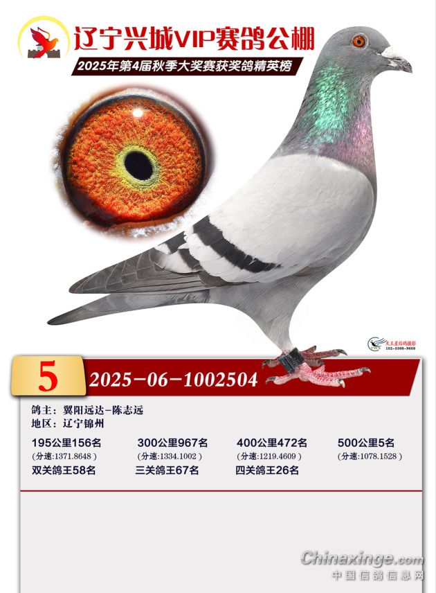 在另外一场普赛中,鸽友王炳选一羽环号为 0178022的鸽子在13:28:05.740率先归巢,空距490.717公里,分速为1248.3399米,获得冠军。事实上大赛的冠、亚、季、殿军、6位和普赛冠军应该是在同一时间一起归巢,足见鸽友王炳选鸽子的实力非凡,这样的成绩在今天的两场比赛中成为真正的亮点。