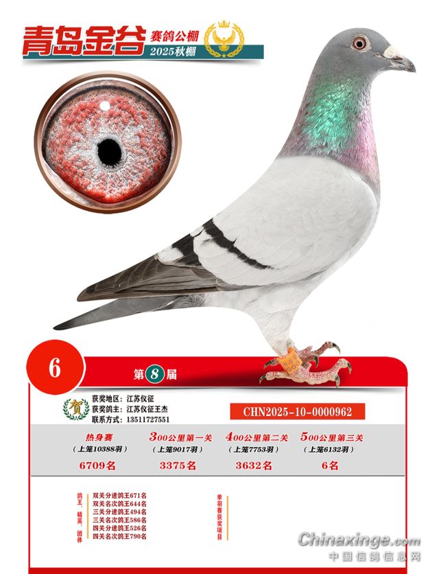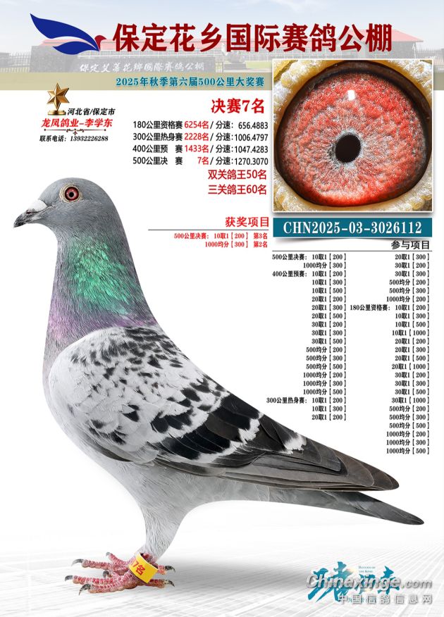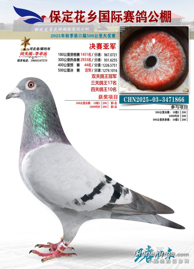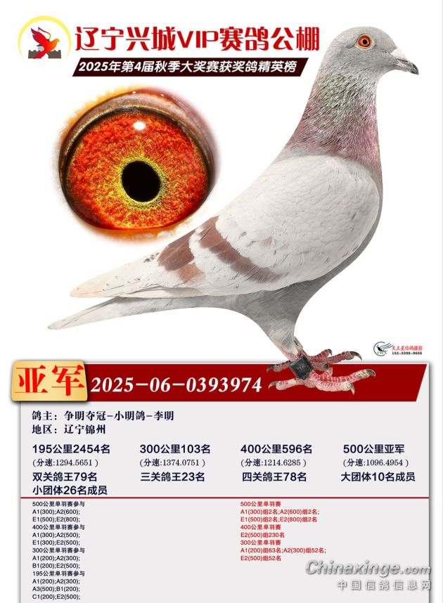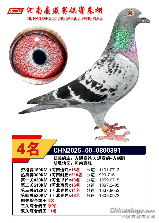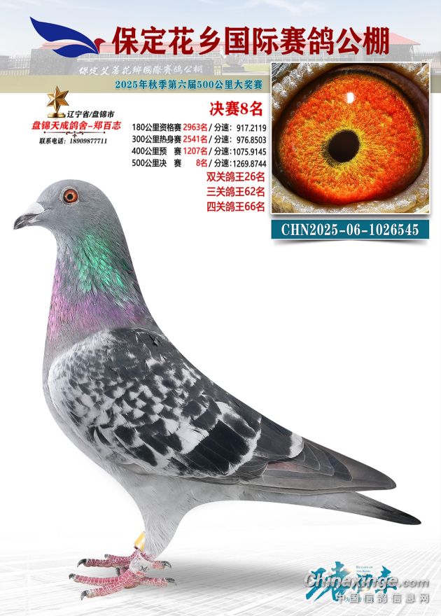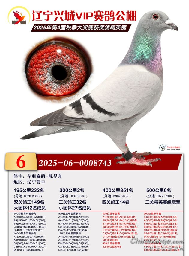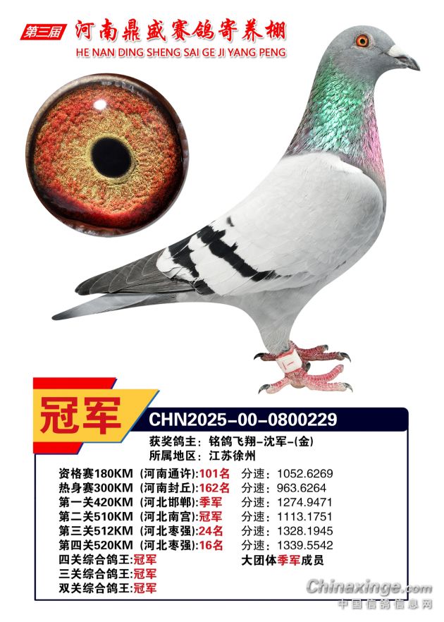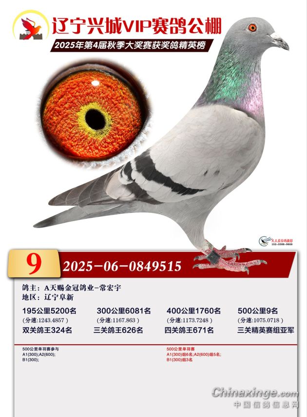 在另外一场普赛中,鸽友王炳选一羽环号为 0178022的鸽子在13:28:05.740率先归巢,空距490.717公里,分速为1248.3399米,获得冠军。事实上大赛的冠、亚、季、殿军、6位和普赛冠军应该是在同一时间一起归巢,足见鸽友王炳选鸽子的实力非凡,这样的成绩在今天的两场比赛中成为真正的亮点。