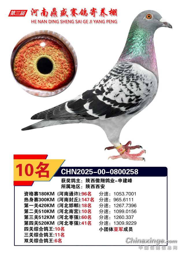 下午鸽友王炳选的四羽鸽子率先在13:28:04.450、13:28:05.830、13:28:06.830和13:33:59.860归巢,空距490.717公里,分速分别为1248.4082米、1248.3351米、1248.2822米和1229.8744米,包揽前四,同时获得前10位中的1、2、3、4、6位,前十占5羽。