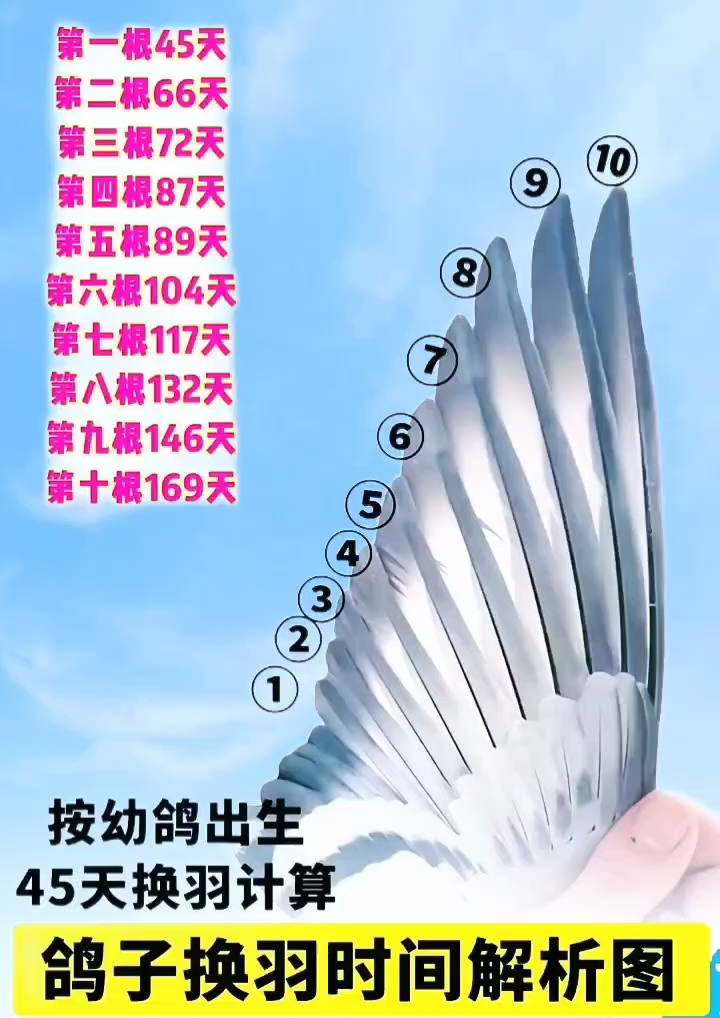 鸽子换羽时间解析图。 ·第一根45天。 ·第二根66天。 ·第三根72天。 ·第四根87天。 ·第五根89天。 ·第六根104天。 ·第七根117天。 ·第八根132天。 ·第九根146天。 ·第十根169天。 按幼鸽出生45天换羽计算。