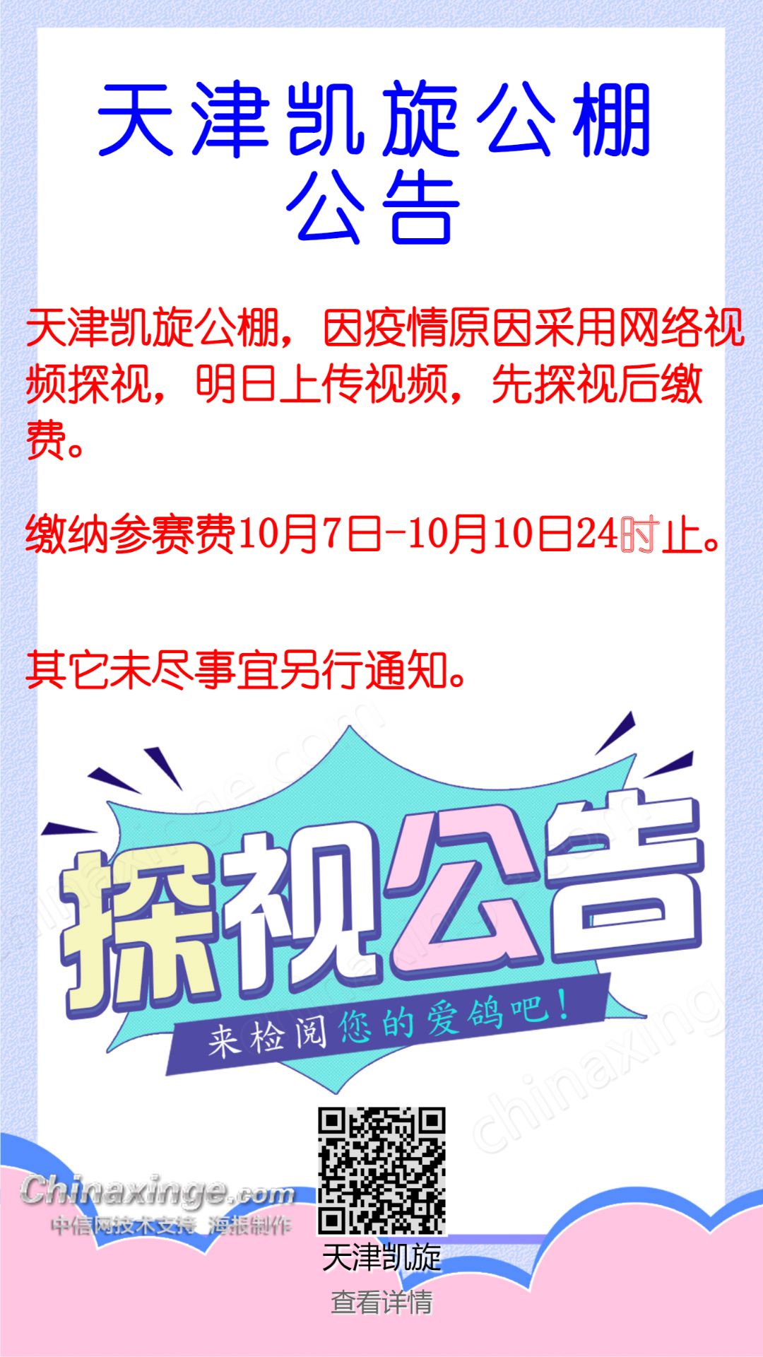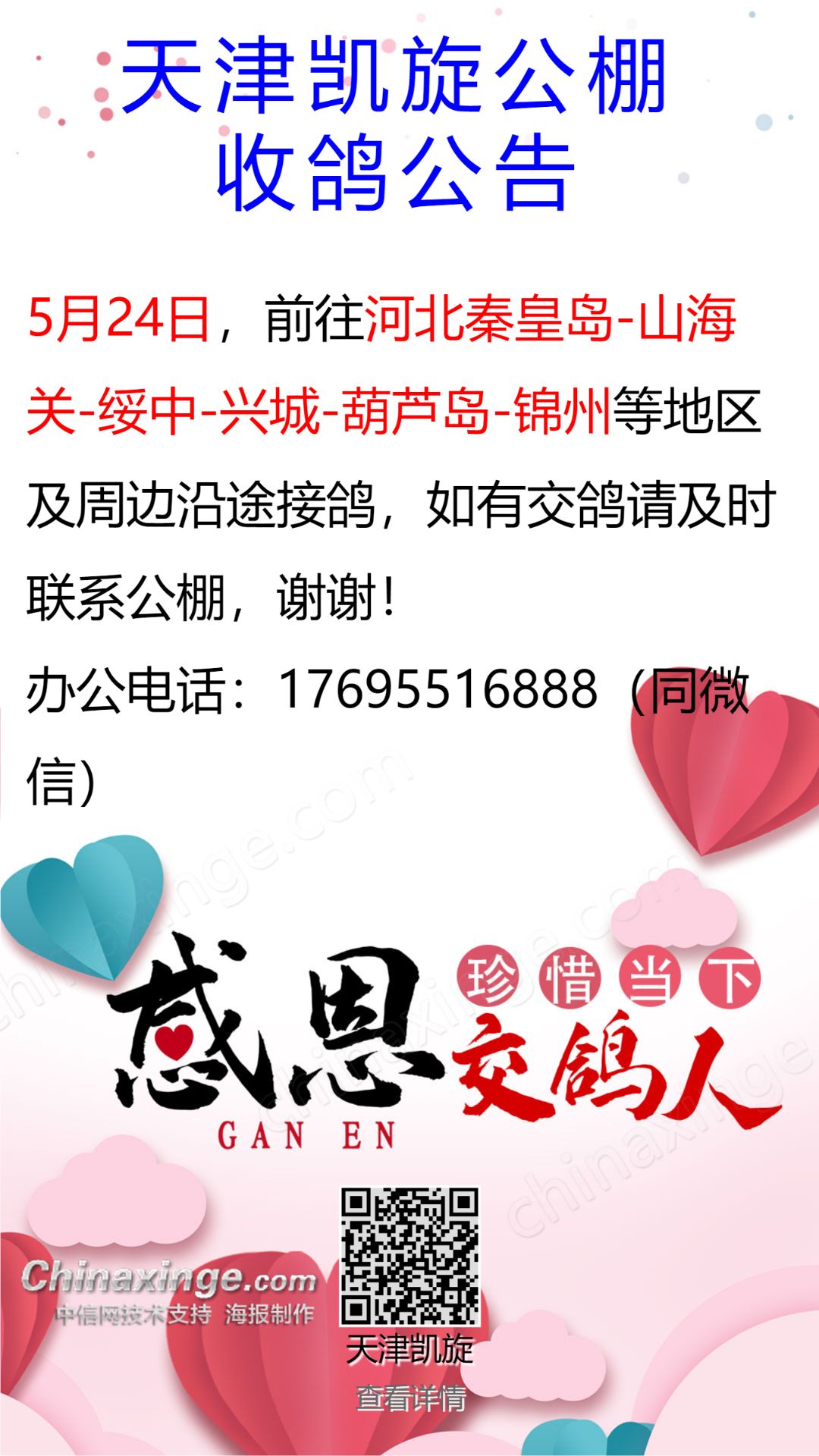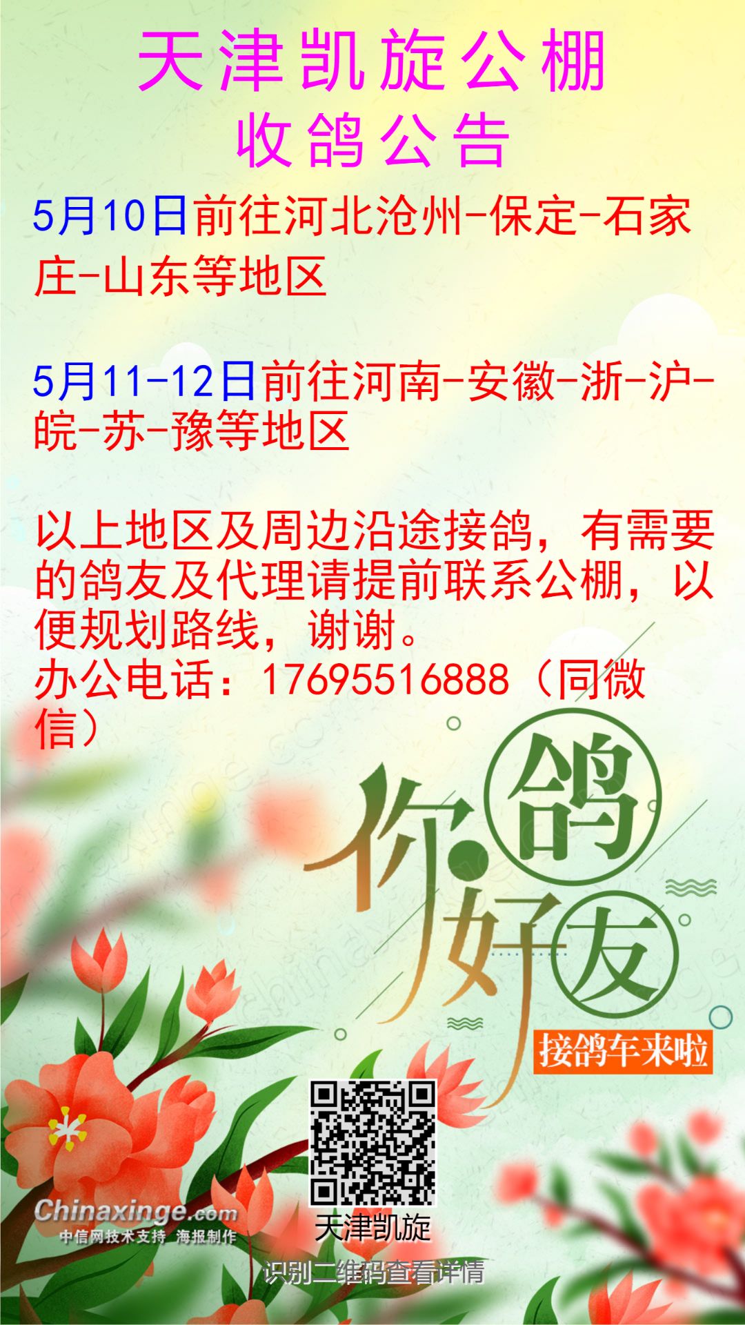 天津凯旋公棚5月10日,11日,12日接鸽公告