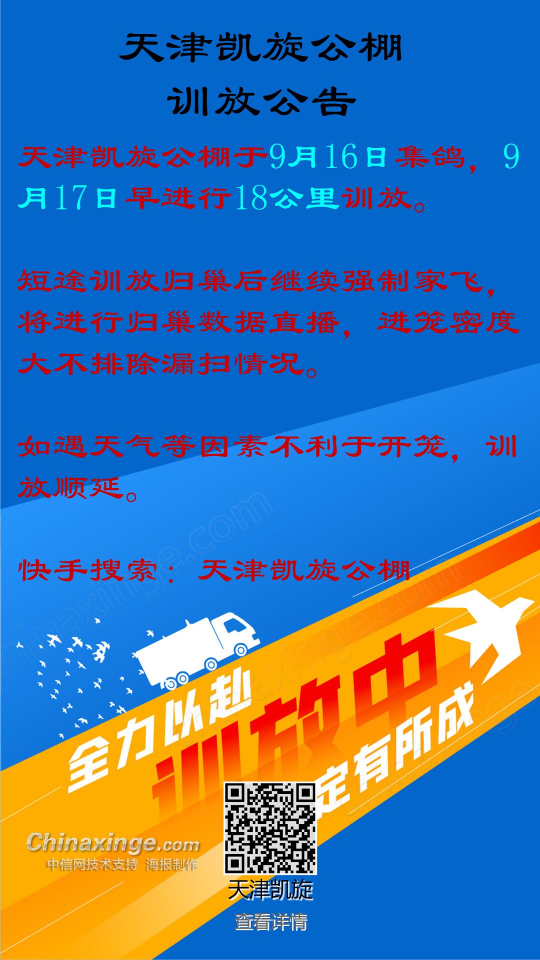 天津凯旋公棚6月18日接鸽公告