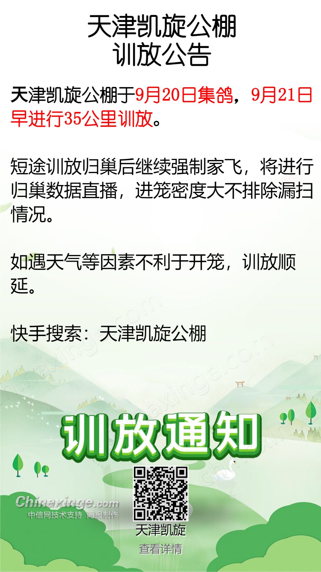 天津凯旋公棚第七次35公里训放公告