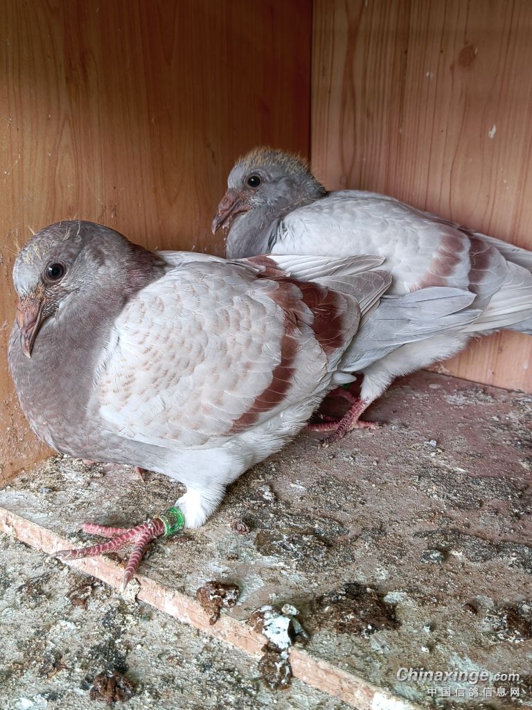 白色公鸽带点莫莉门血统和瓦灰雌鸽,第一窝幼崽的颜色是这样的。