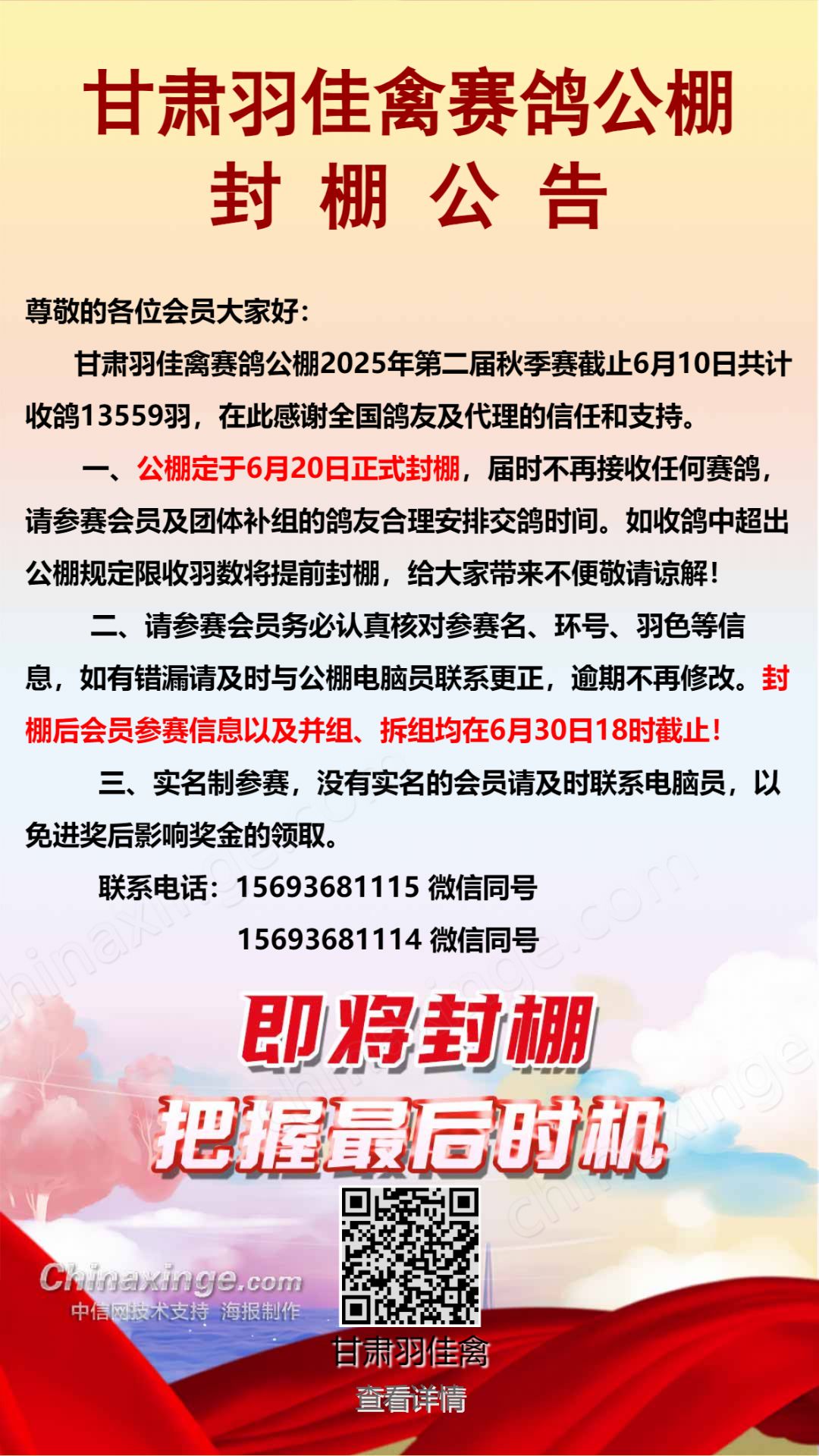 甘肃羽佳禽赛鸽公棚封棚倒计时1天