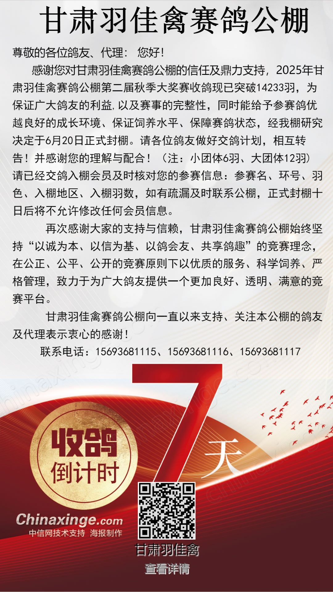 甘肃羽佳禽赛鸽公棚收鸽倒计时还剩6天!