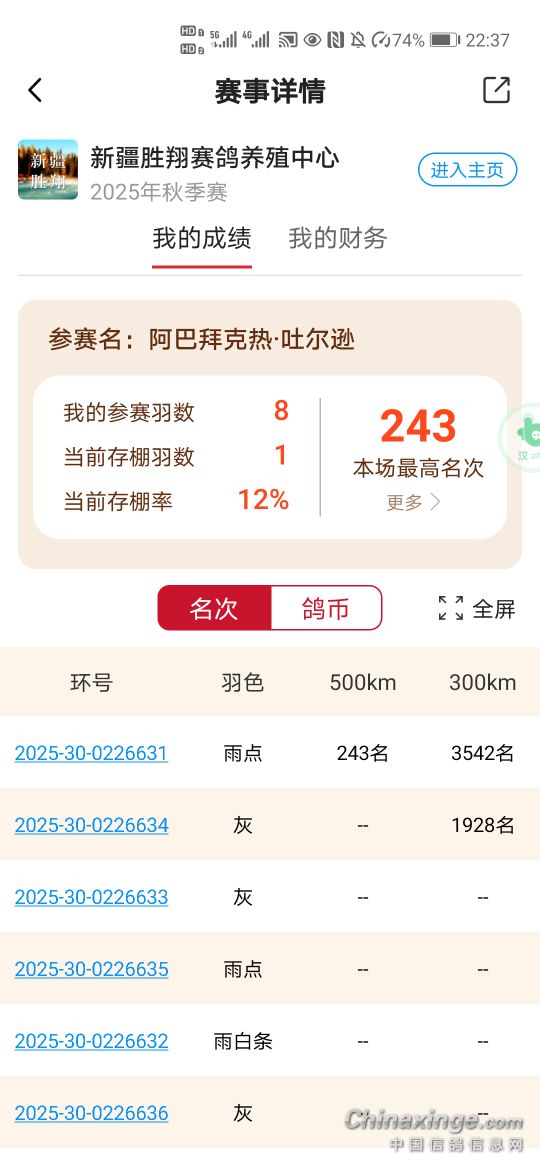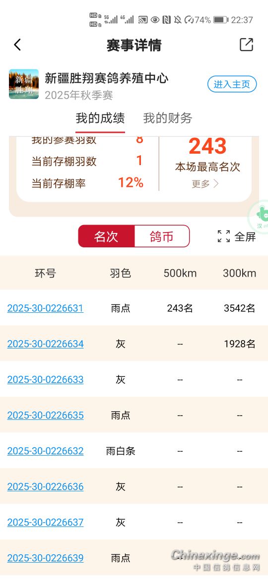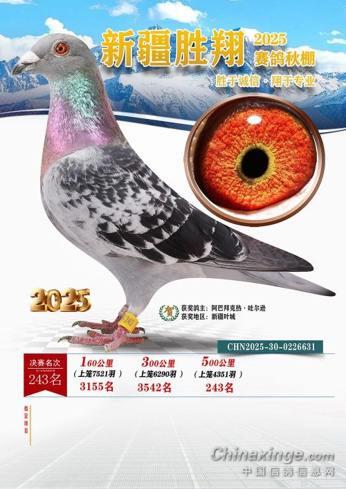 【科汇天诚】足环:25300226631 距离:487 名次:243 归巢时间:10月16日16:53:27 --胜翔赛鸽公棚