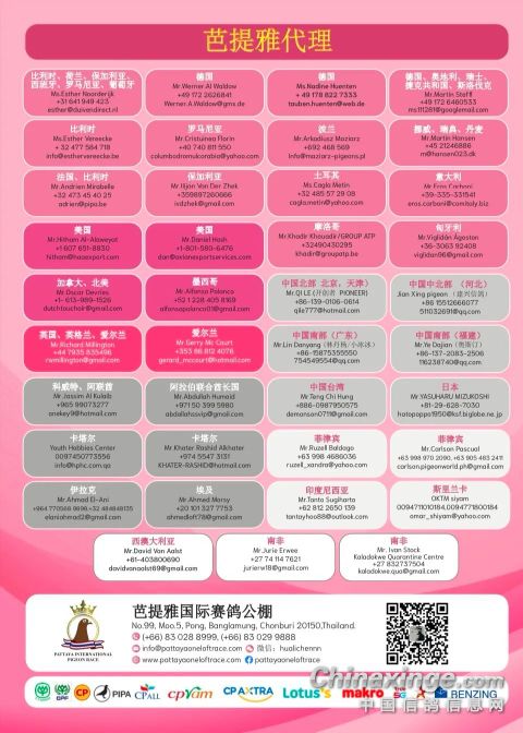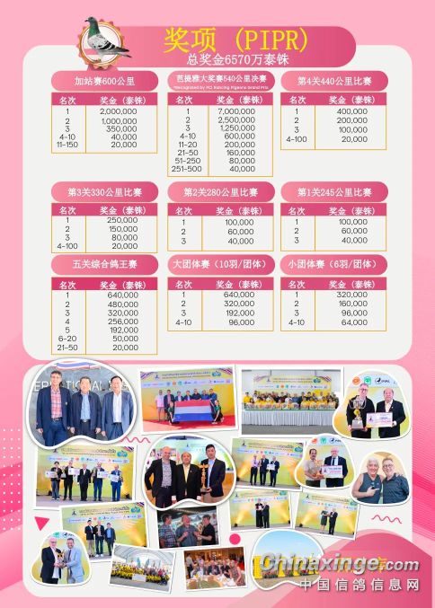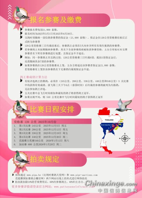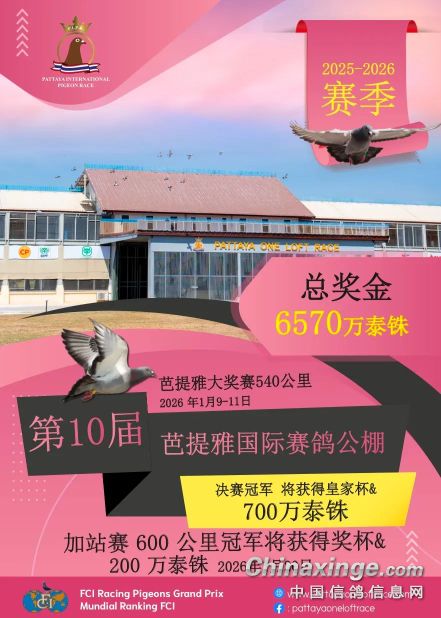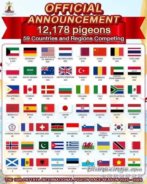 2025赛季泰国芭提雅公棚章程及各国参赛羽数排名 :来自全球59个国家和地区的12178羽赛鸽,正式参与第10届芭提雅国际赛鸽公棚2025赛季的比赛。 中国交鸽608羽,排在第六。科威特交鸽最多2193羽。 资格赛 120公里 2025年10月份举办 1、第1关 245公里 2025年12月5日 2、第2关 280公里 2025年12月12日 3、第3关 330公里 2025年12月19日 4、第4关 440公里 2025年12月30日 5、芭提雅大奖赛 540公里 2026年1月12日 6、加站赛 600公里 2026年1月20日