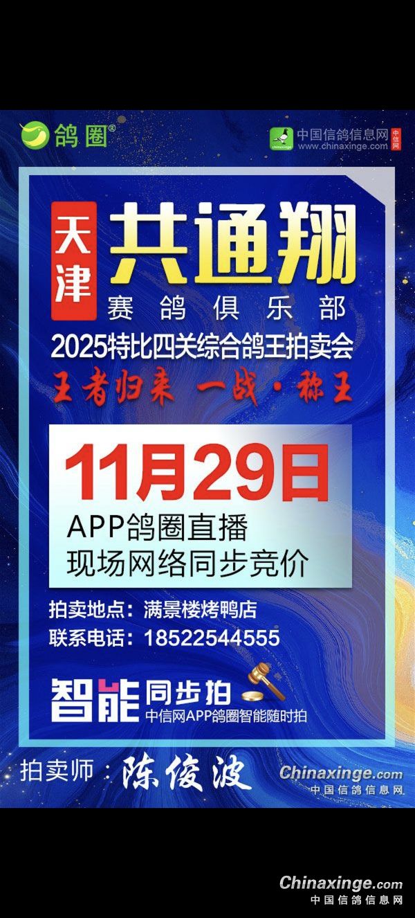 天津共通翔赛鸽俱乐部将于11月29日举行获奖鸽拍卖会,同时俱乐部携手中信网开启“鸽圈智能同步拍卖”服务,在鸽圈直播拍卖会现场实况,并开启现场与网络同步竞价,让鸽友们边看直播,边同步拍卖,无法前往拍卖会现场的鸽友,可使用中信网手机APP,观看鸽圈现场视频直播,并与现场鸽友同步出价,享受足不出户参与竞拍的便利!