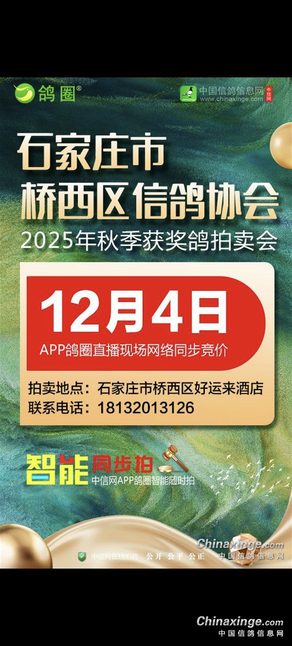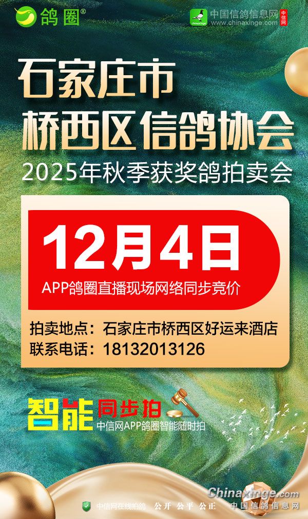 河北石家庄桥西区信鸽协会将于12月4日举行获奖鸽拍卖会,同时协会携手中信网开启“鸽圈智能同步拍卖”服务,在鸽圈直播拍卖会现场实况,并开启现场与网络同步竞价,让鸽友们边看直播,边同步拍卖,无法前往拍卖会现场的鸽友,可使用中信网手机APP,观看鸽圈现场视频直播,并与现场鸽友同步出价,享受足不出户参与竞拍的便利!