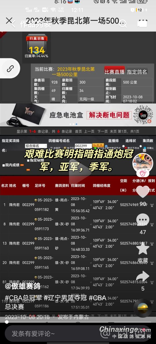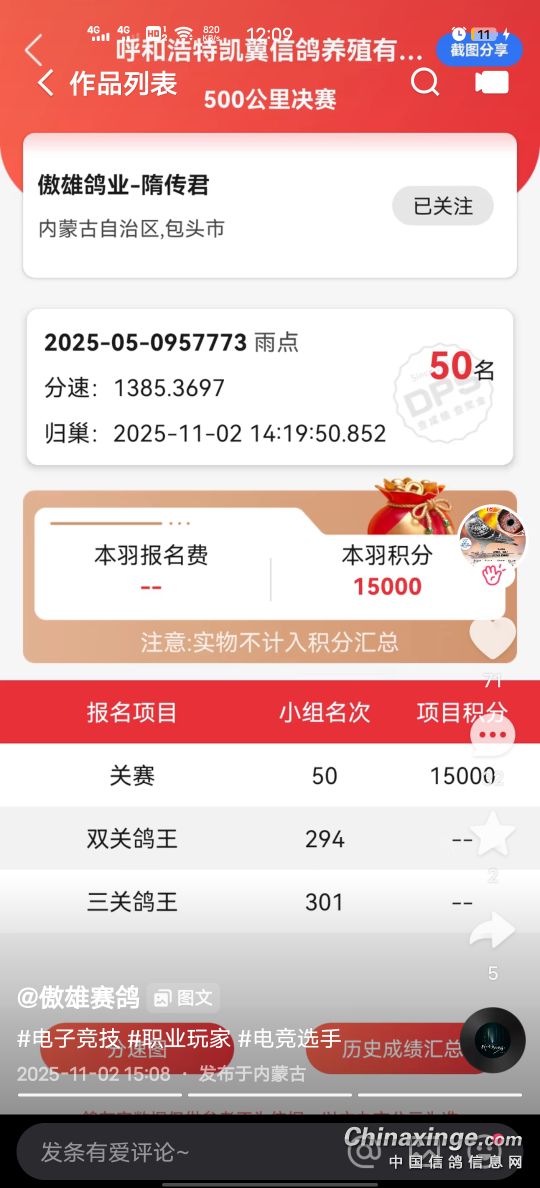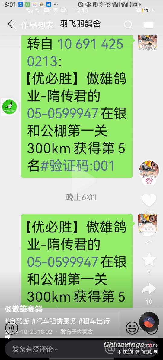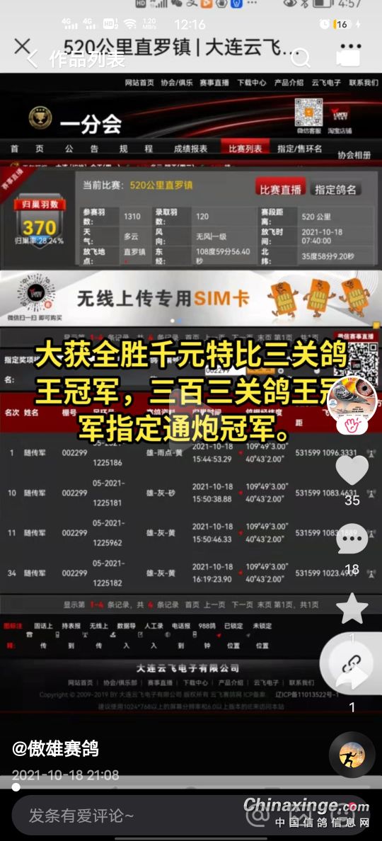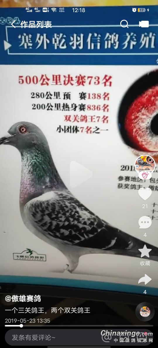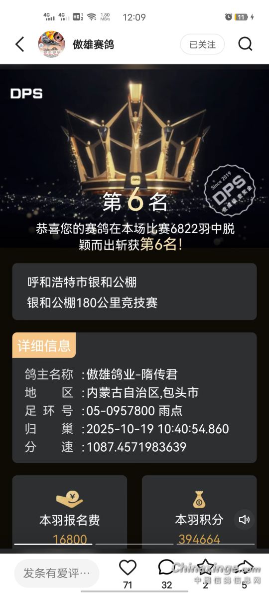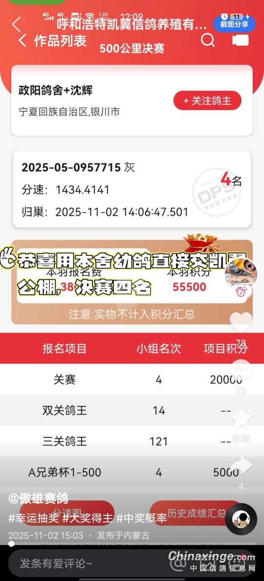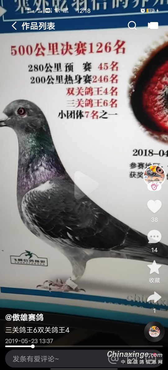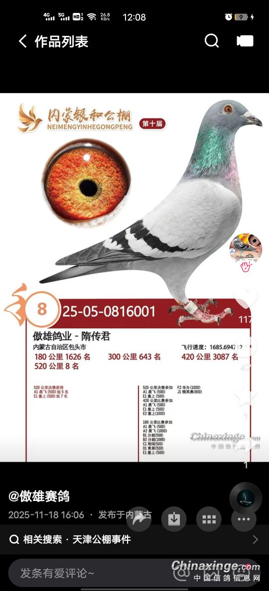 雨速来自于速霸龙配对考夫曼0057,浅斑一号又来自于雨速配对德拉帕。这路鸽子一直玩儿了十多年了,越降代越飞代代有公棚第一梯队。
