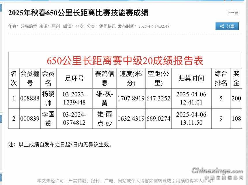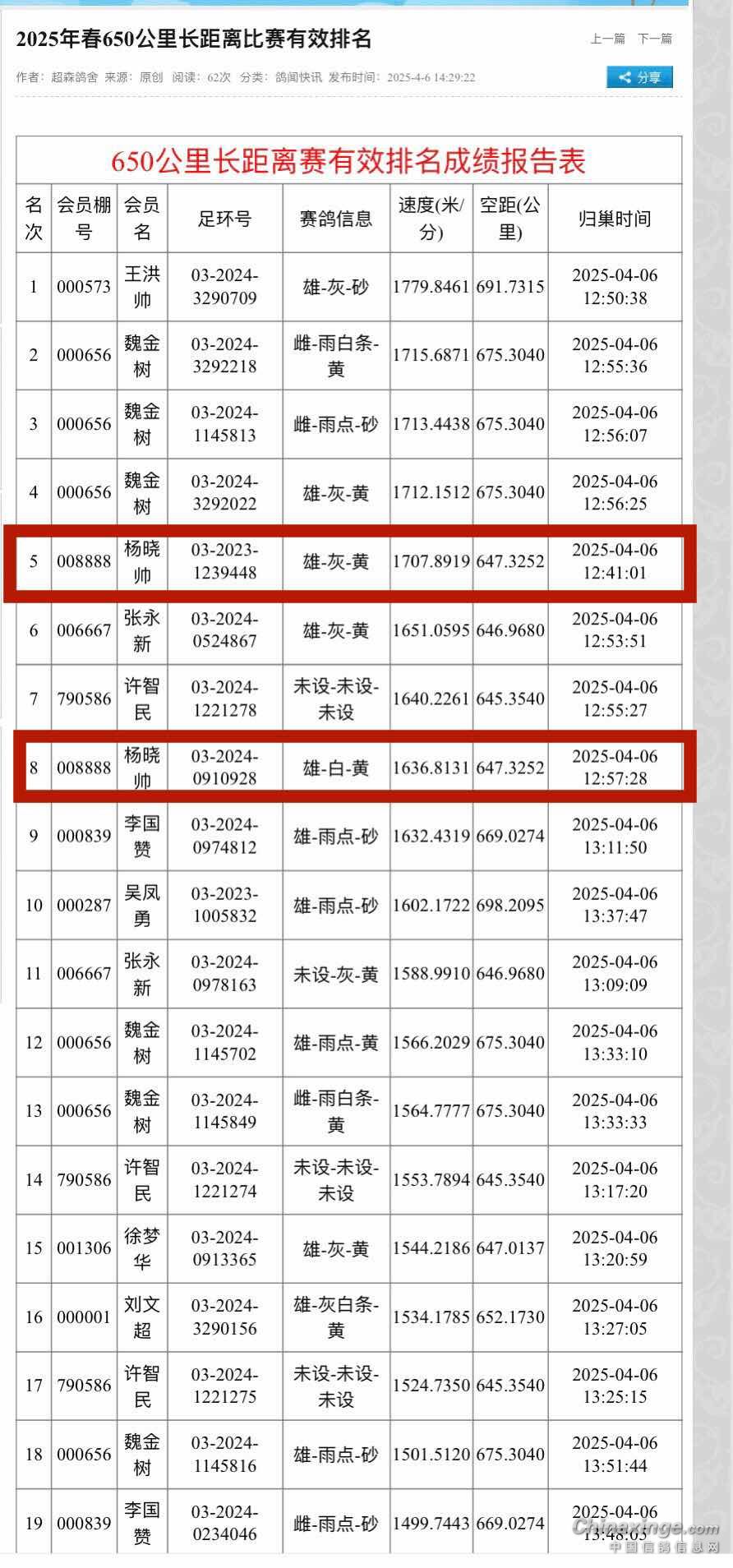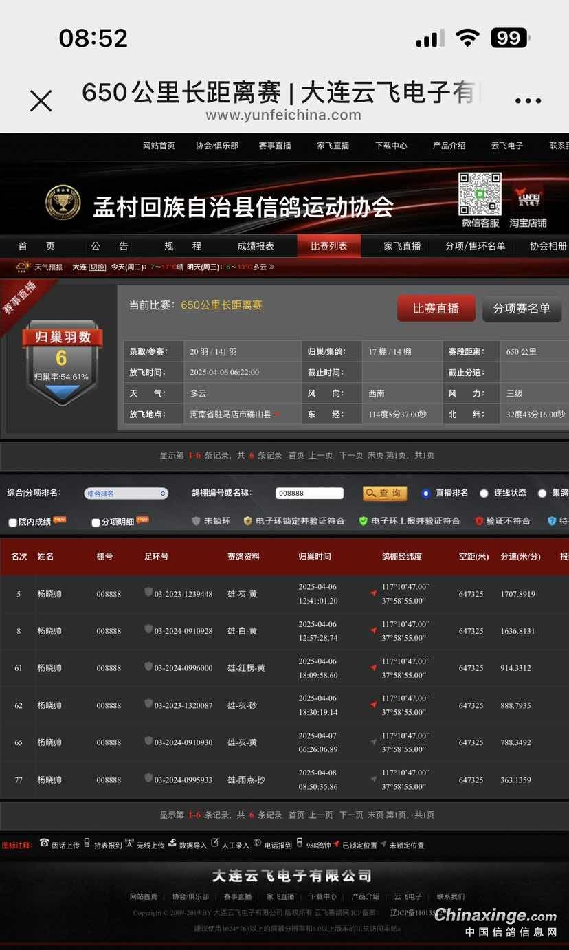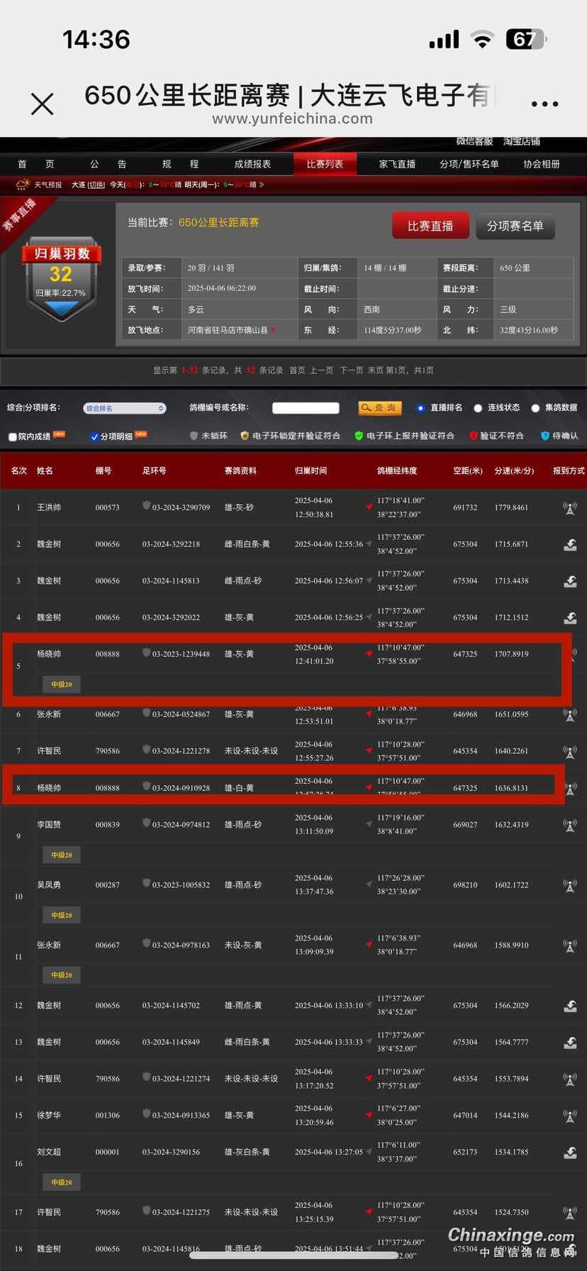 650公里河南确山站,全会第一只报道,飙出1707分数,本舍获得5名-8名,前十进两羽,放6羽归6羽归巢率百分百