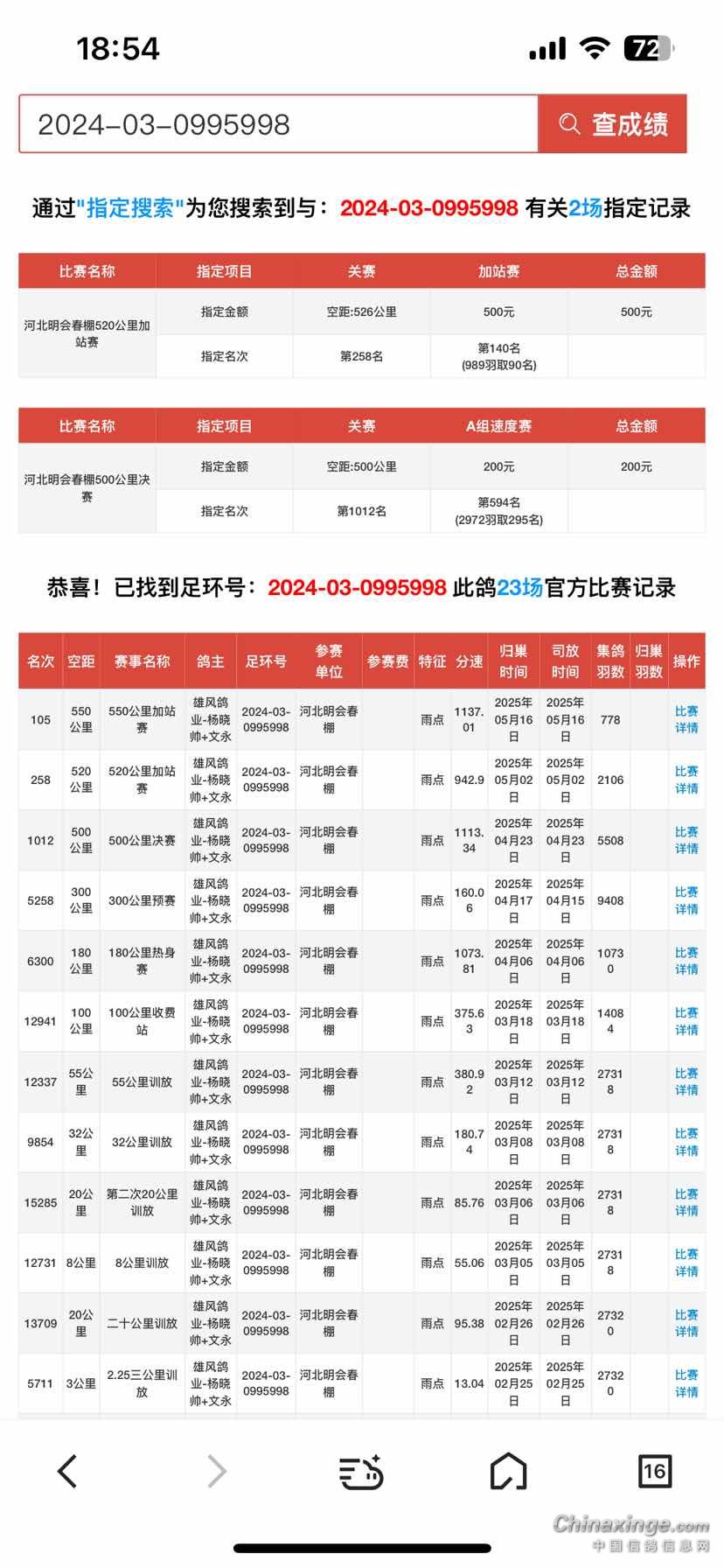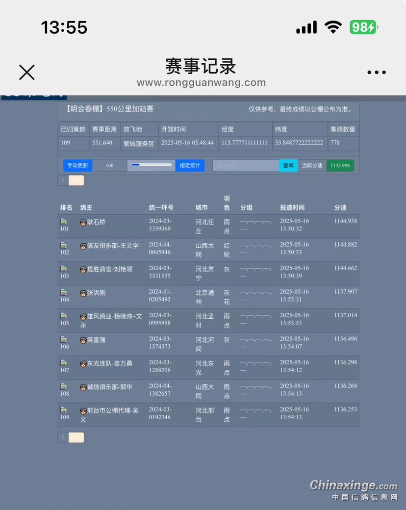 明会春棚,500公里1012名,520公里加站赛258名,当天仅归400多羽,550公里加站赛105名