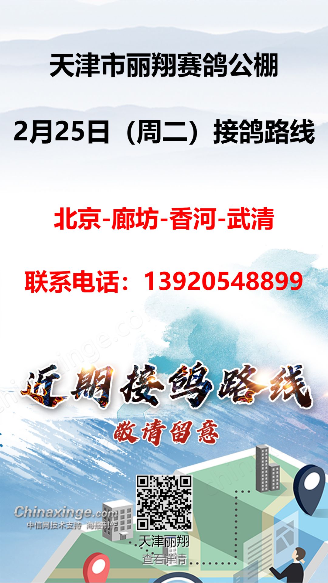 天津丽翔赛鸽公棚2月25日(周二)北京方向接鸽