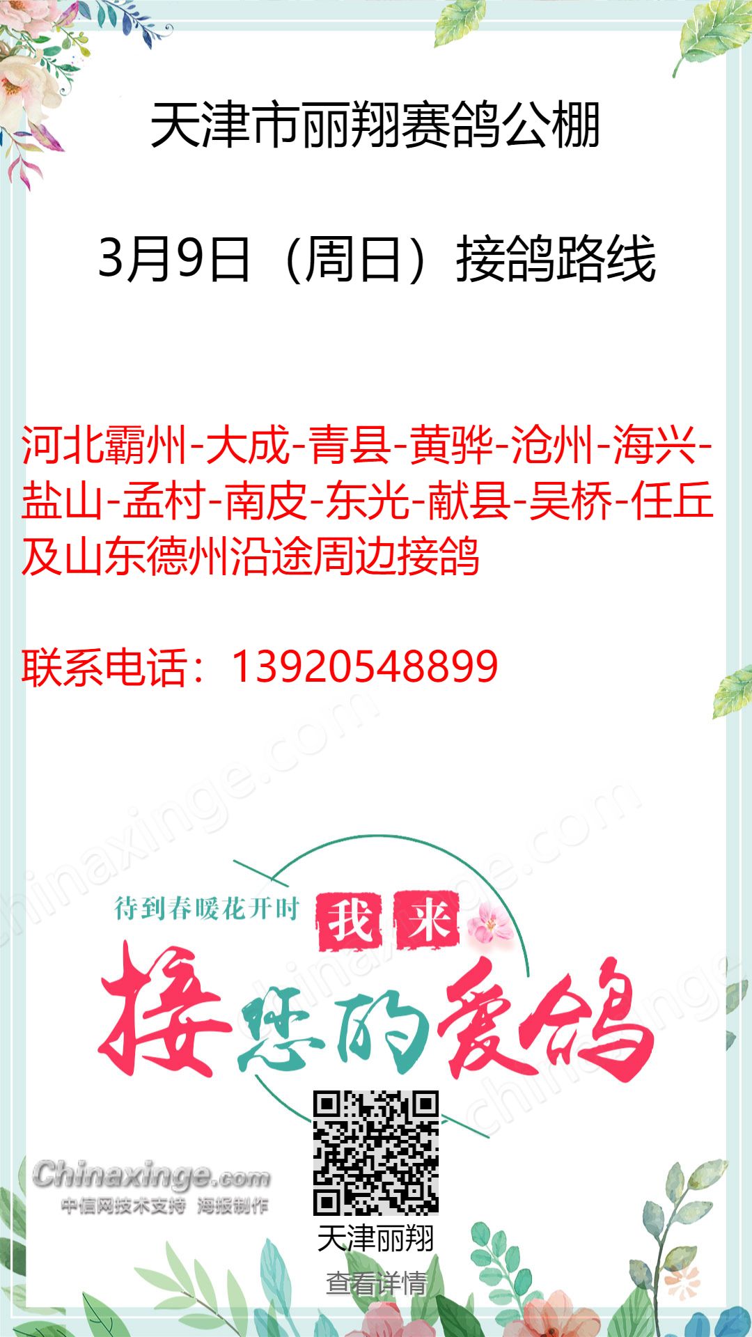 天津丽翔赛鸽公棚3月9日(周日)河北方向接鸽