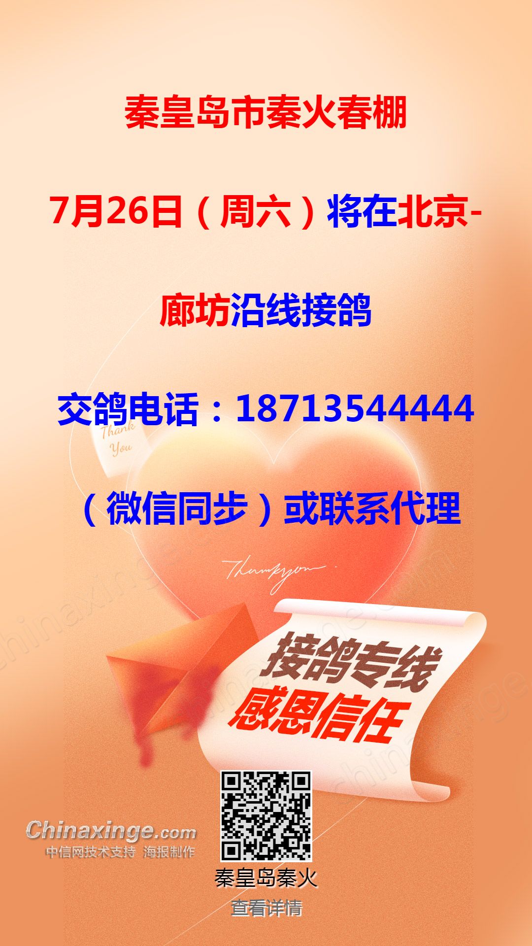 7月26日(周六)将在北京-廊坊沿线接鸽