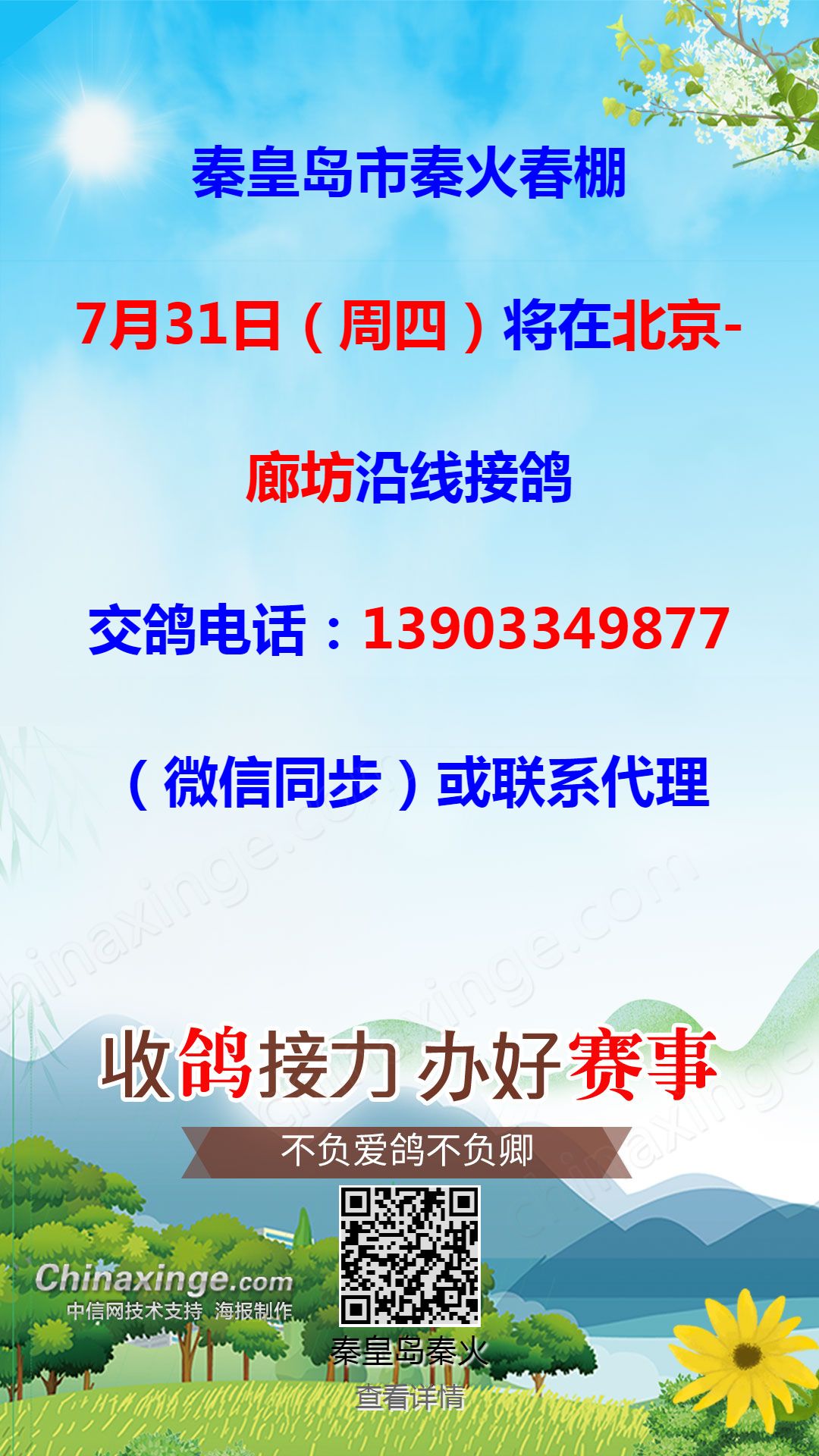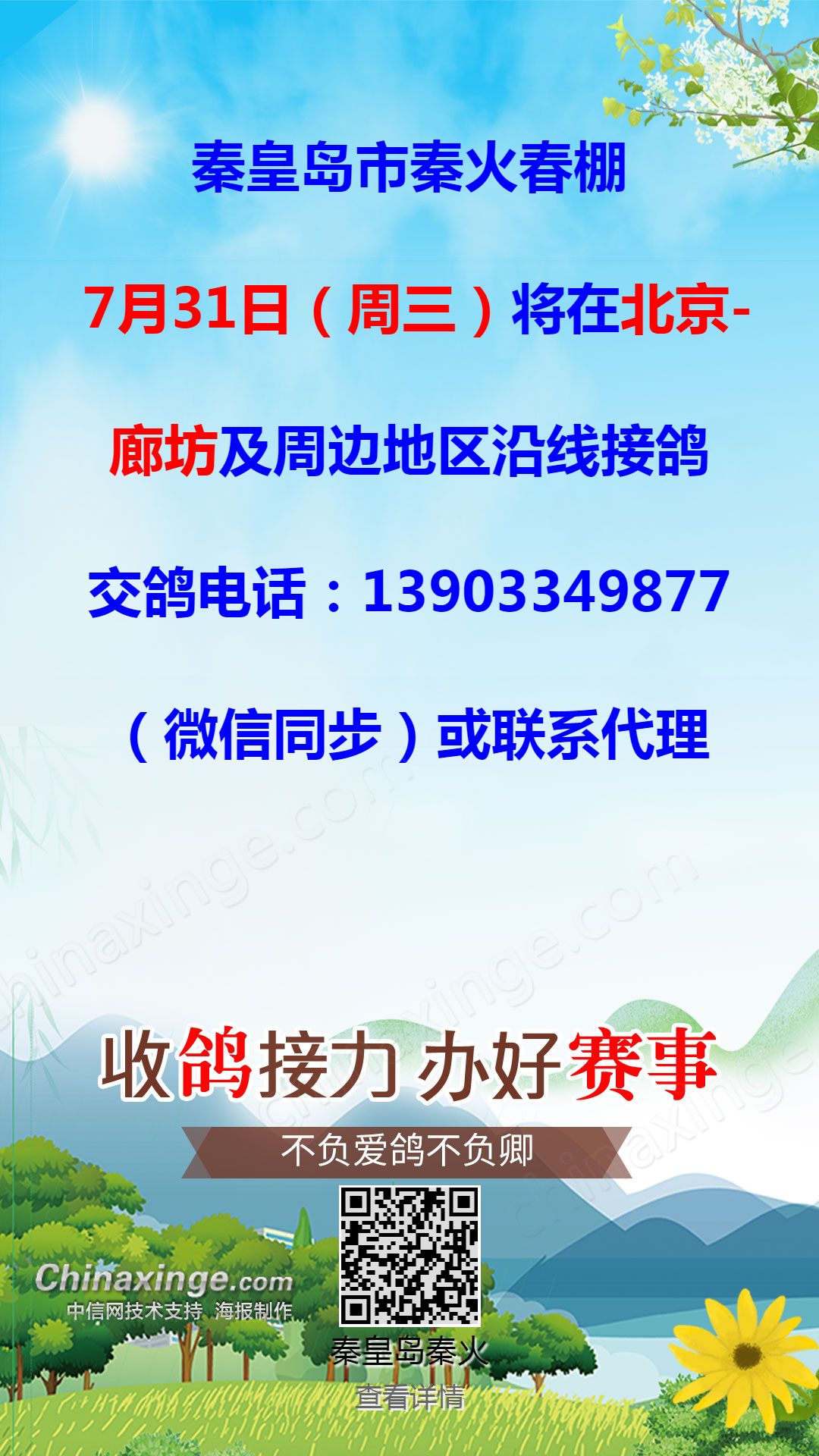 7月31日(周四)将在北京-廊坊沿线接鸽