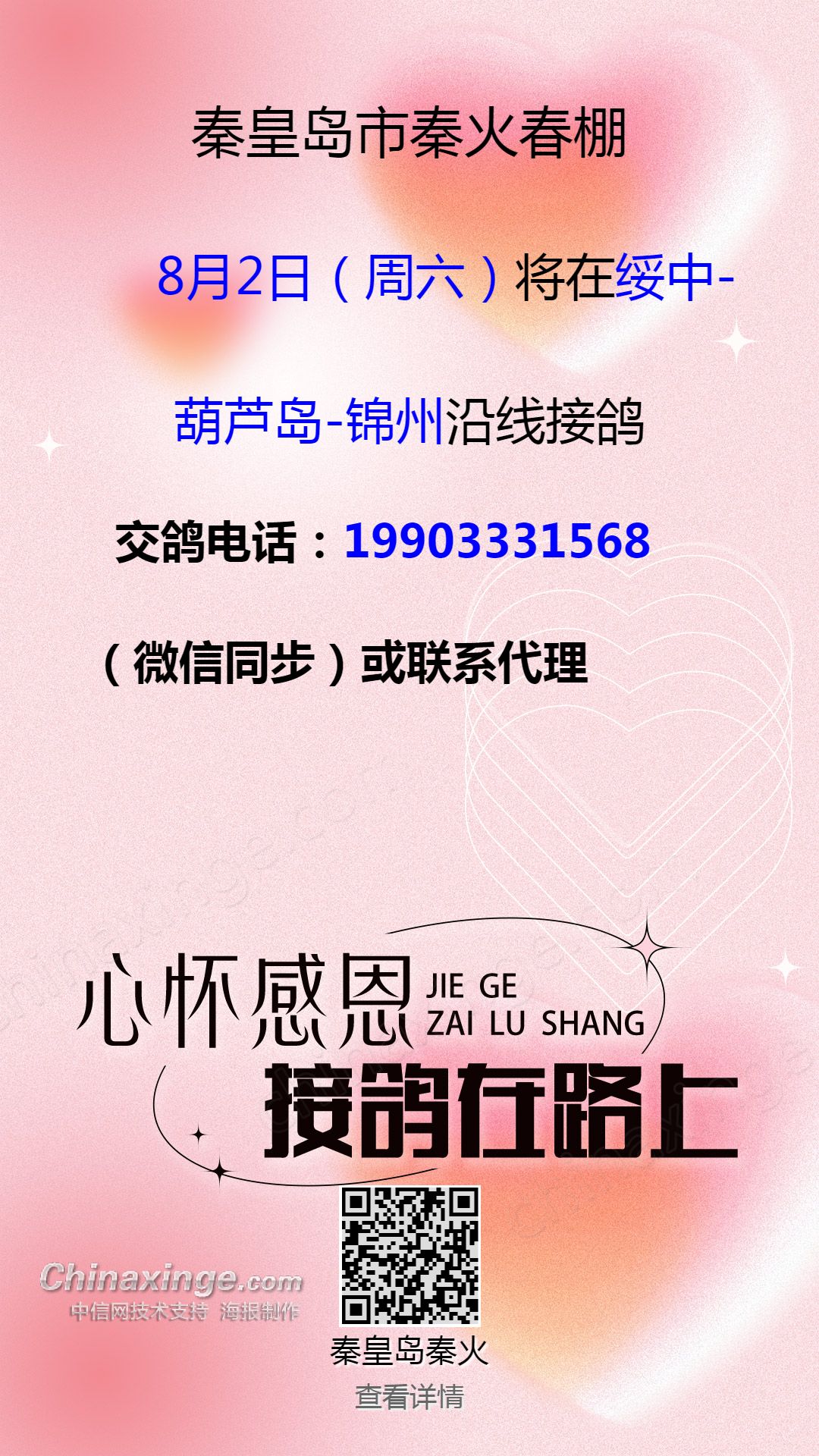 8月2日(周六)将在绥中- 葫芦岛-锦州沿线接鸽