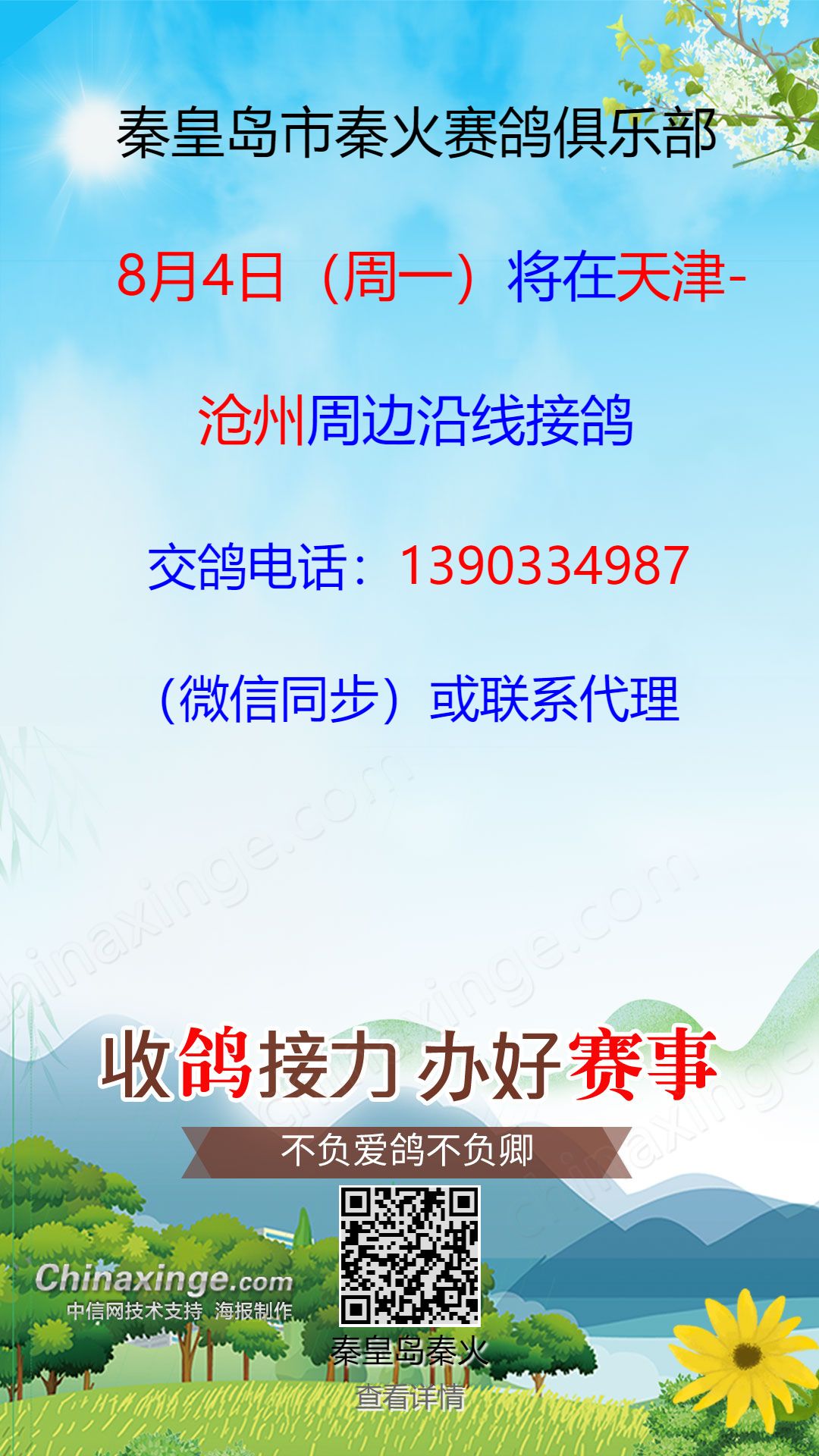 8月4日(周一)将在天津-沧州周边沿线接鸽