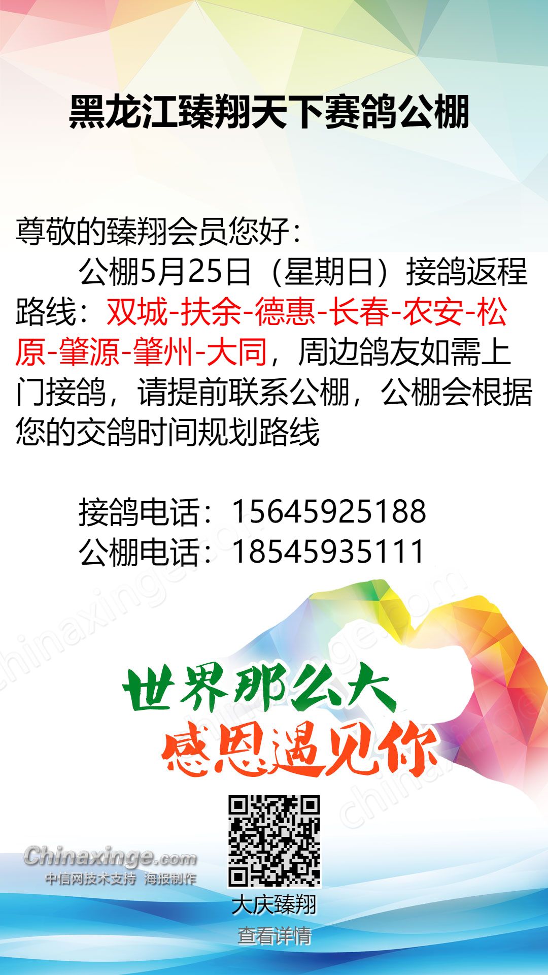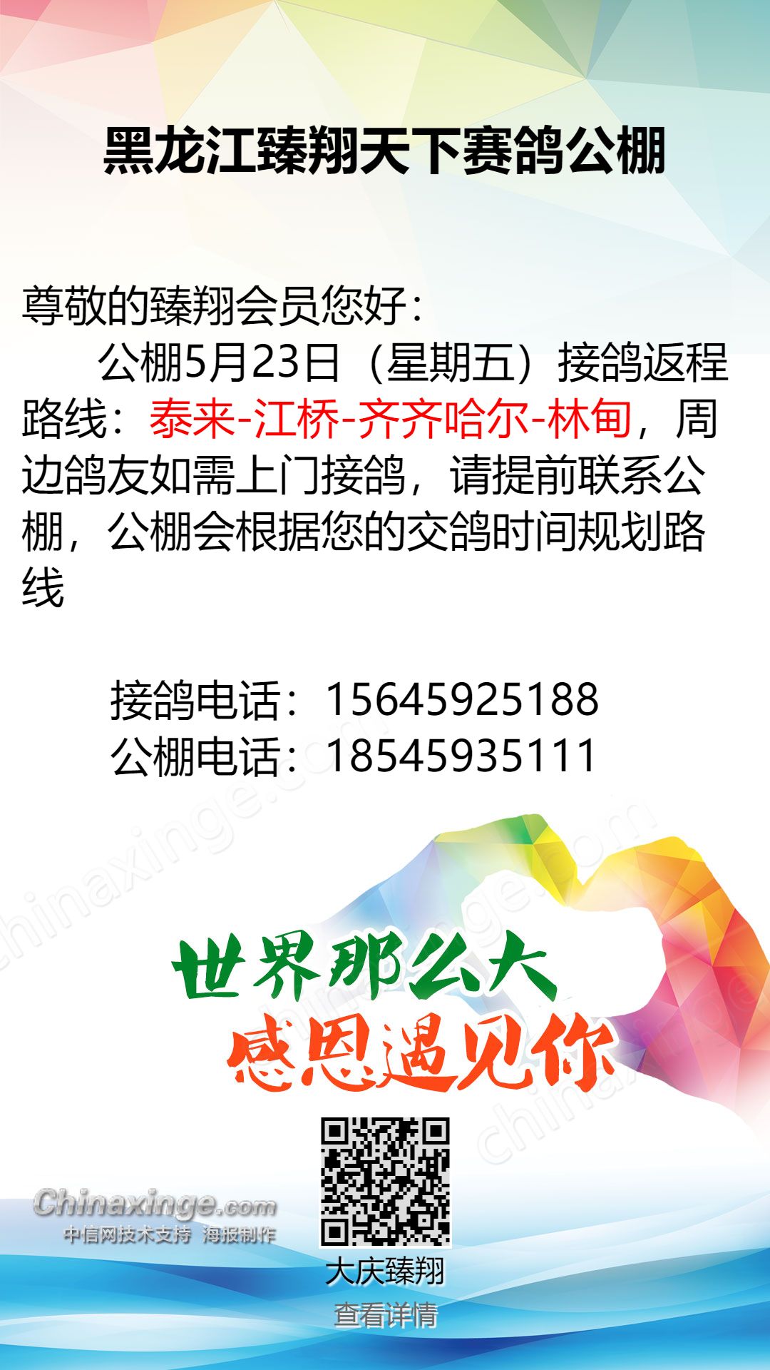 臻翔公棚5月23日接鸽路线:泰来,江桥,齐齐哈尔,林甸方向