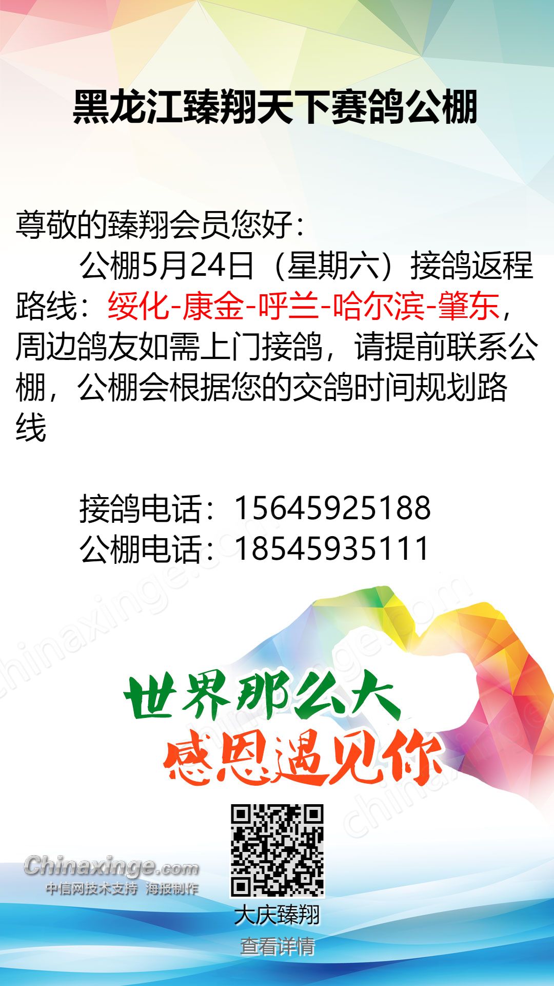 臻翔公棚5月24日接鸽路线绥化,康金,呼兰,哈尔滨,肇东方向