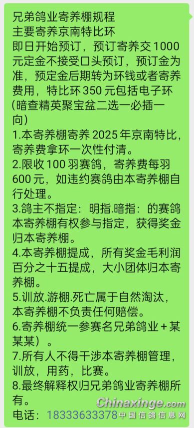 2024年公棚合作方式 2024年公棚主力配对9对,公棚合作我出鸽子支援老鸽友们,参赛名字必须是廊坊兄弟鸽业-某某某,赢取奖金交参赛费鸽友获得百分之80,本人获得百分之二十,如鸽子在公棚获奖拍卖奖金归廊坊兄弟鸽业,如果未能获奖迟归鸽归交参赛费鸽友,指定既交参赛费鸽友压,如果鸽友不压本人可以压,鸽友们可以选择公棚,如果没有好的公棚廊坊兄弟鸽业可以推荐好的公棚,有想玩的和我联系2024年幼鸽不多定准不在外定 也可以买幼鸽直接交公棚