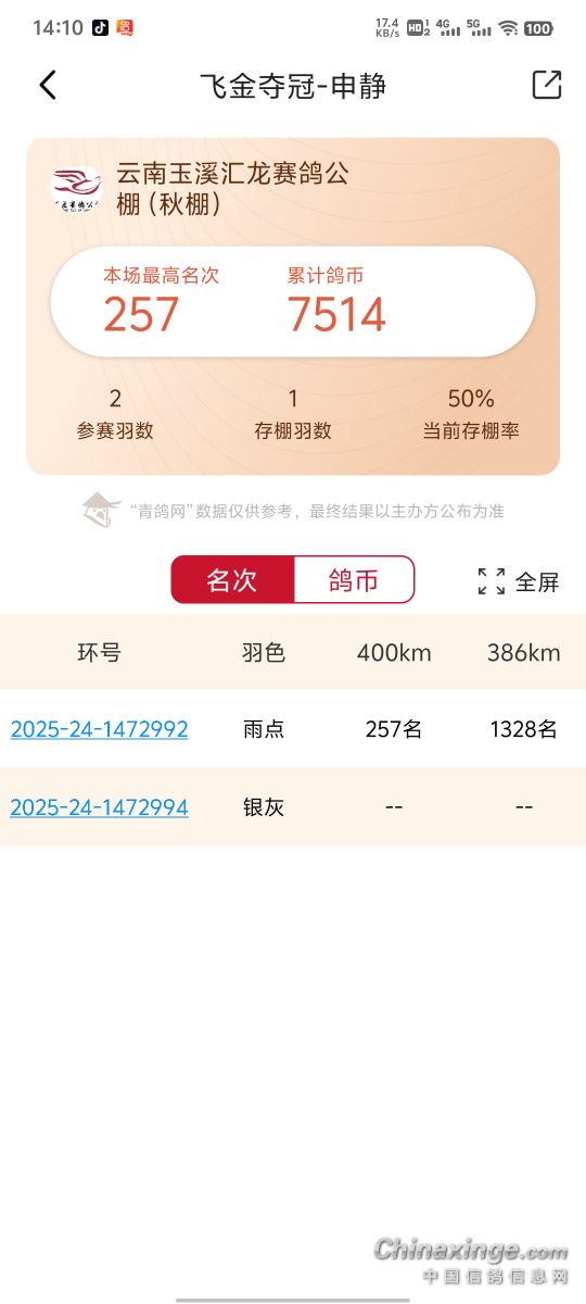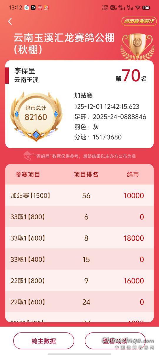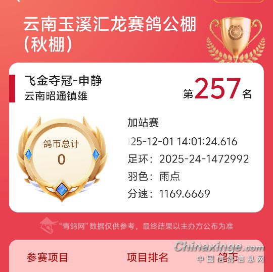 去年在云南东川天南铜都(秋)小棚一千二百多分速才飞了九百多名是我千公里48名配对的,今年换了个速度快的雌鸽试验一下,希望2023年顺风顺水。