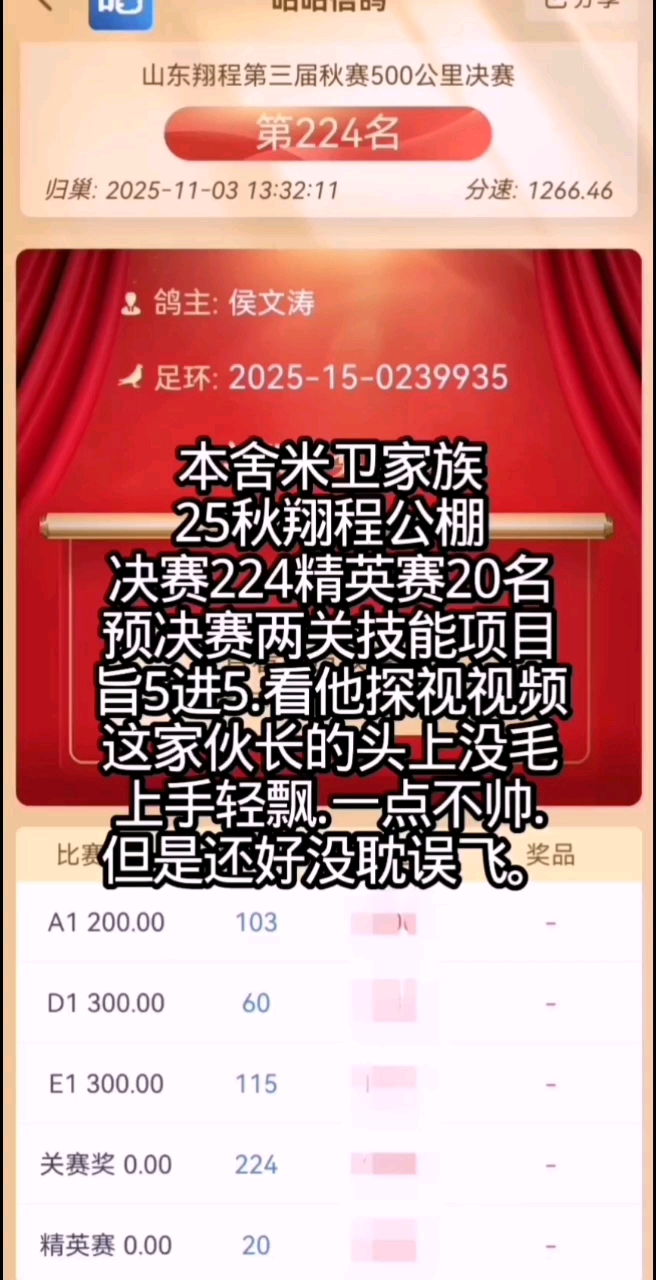 本舍米卫鸽王家族支援全国各地鸽友惊喜不断。感谢张民兄弟发来的获奖喜报,也祝贺兄弟使用本舍米卫家族种鸽,作出幼鸽征战翔程公棚,既预赛飞出17名,决赛又飞出436名677名1081名,探视缴费4羽,决赛上3进3,决赛站百发百中。本舍米卫鸽王家族 你有信心他定不负期待 为兄弟喝彩!