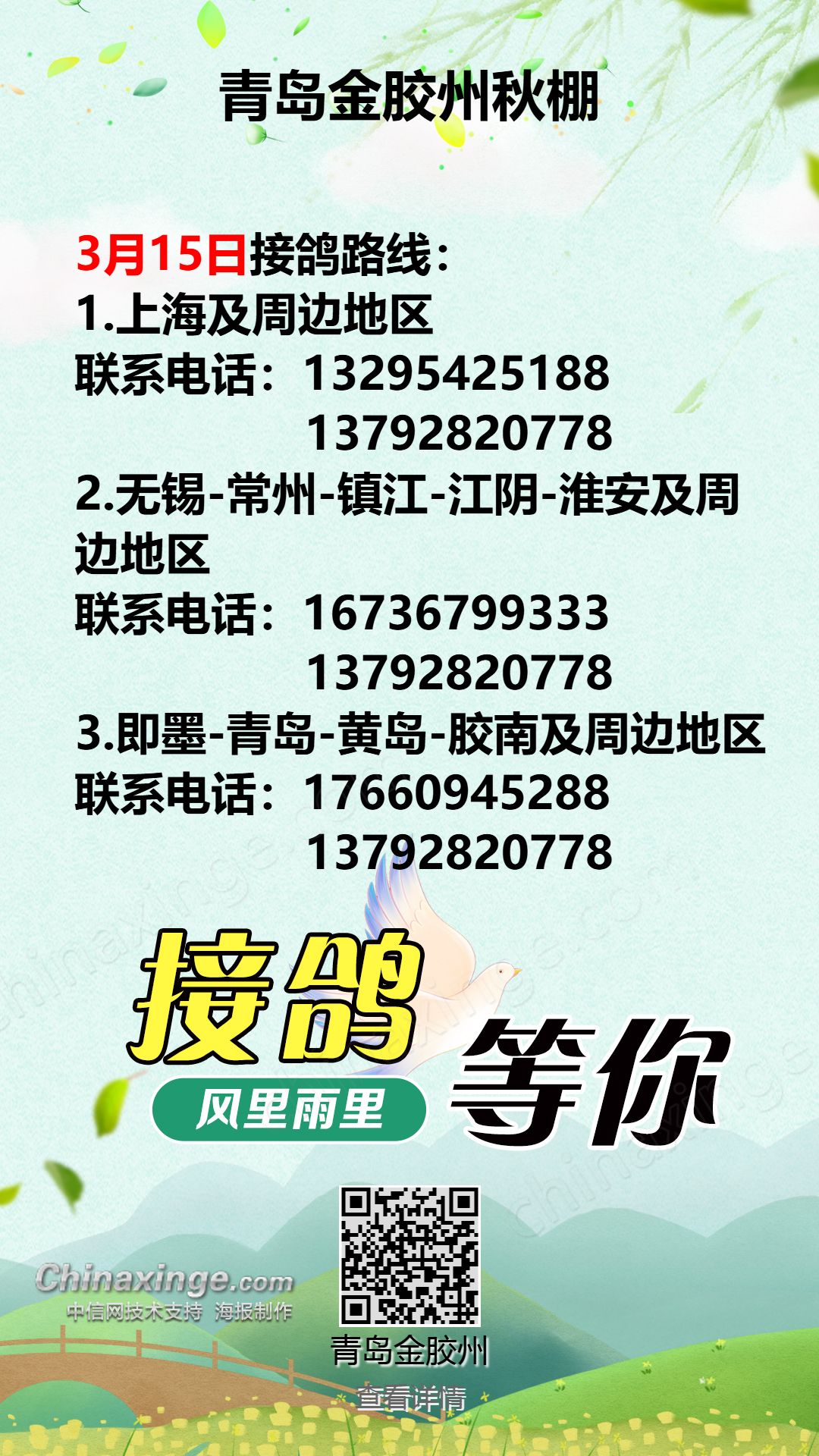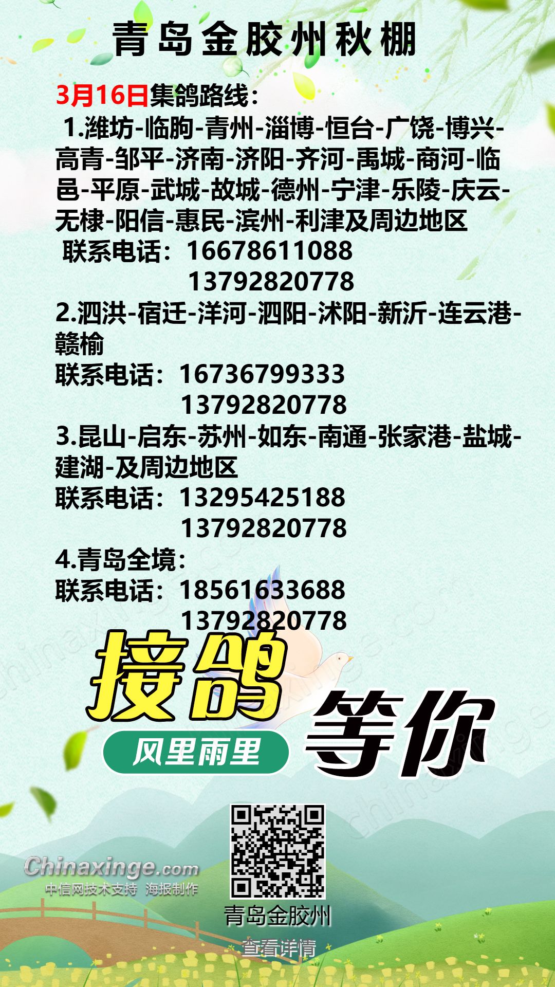 青岛金胶州秋棚3月15日接鸽路线(1)