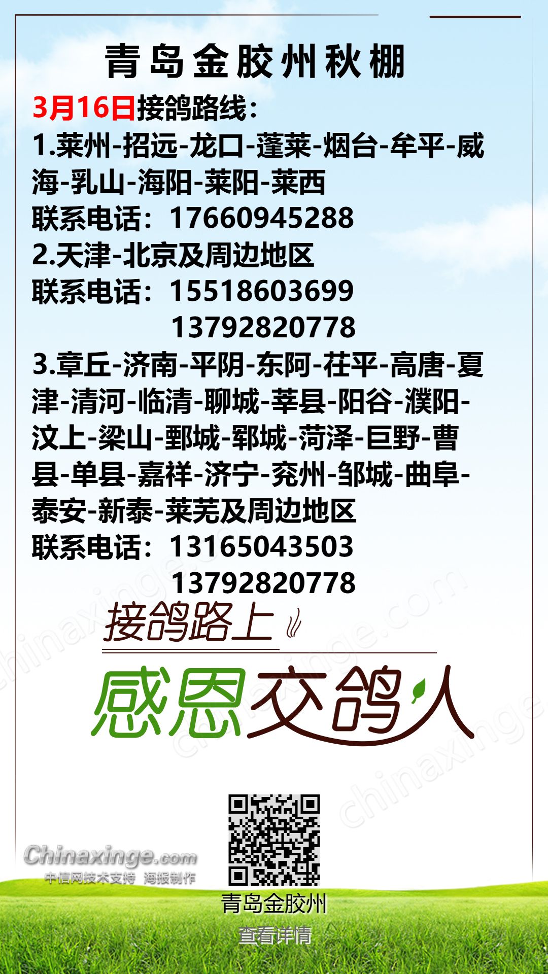 青岛金胶州秋棚3月13日接鸽路线(1)