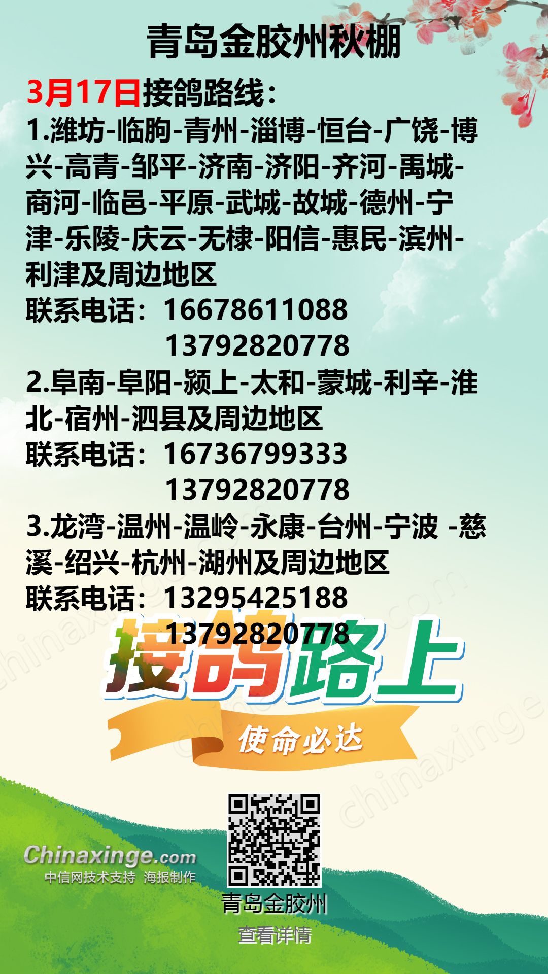 青岛金胶州秋棚3月17日接鸽路线(1)