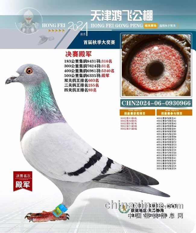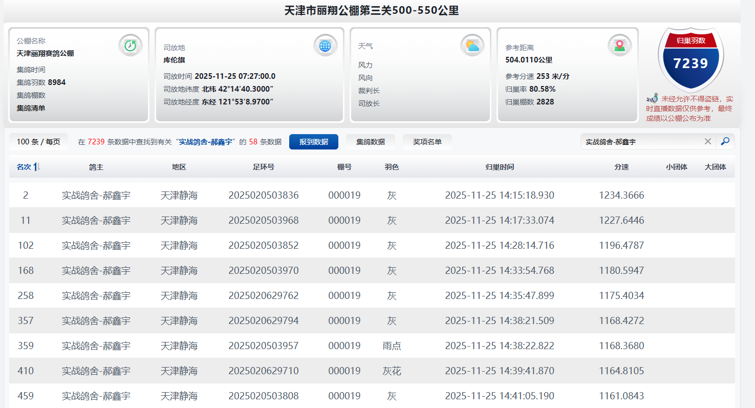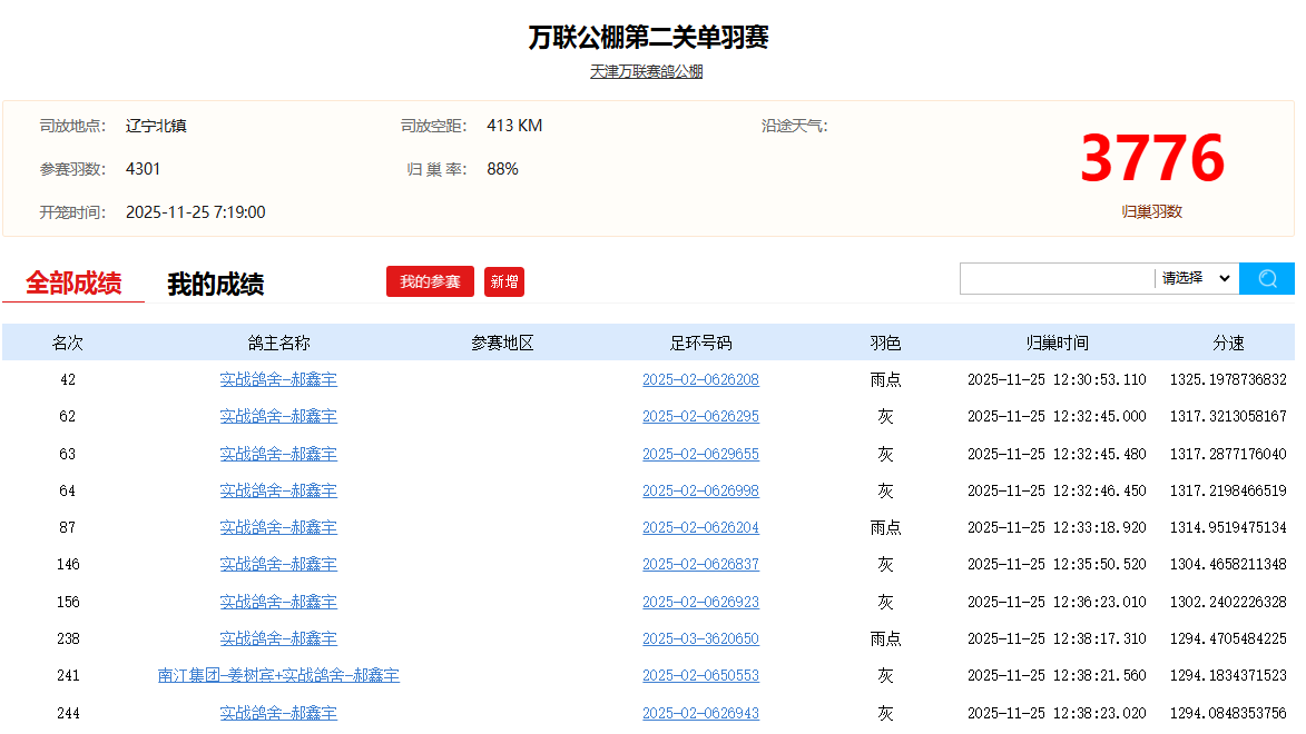 最后,祝贺天津实战鸽舍-郝鑫宇,2025年赛绩辉煌。