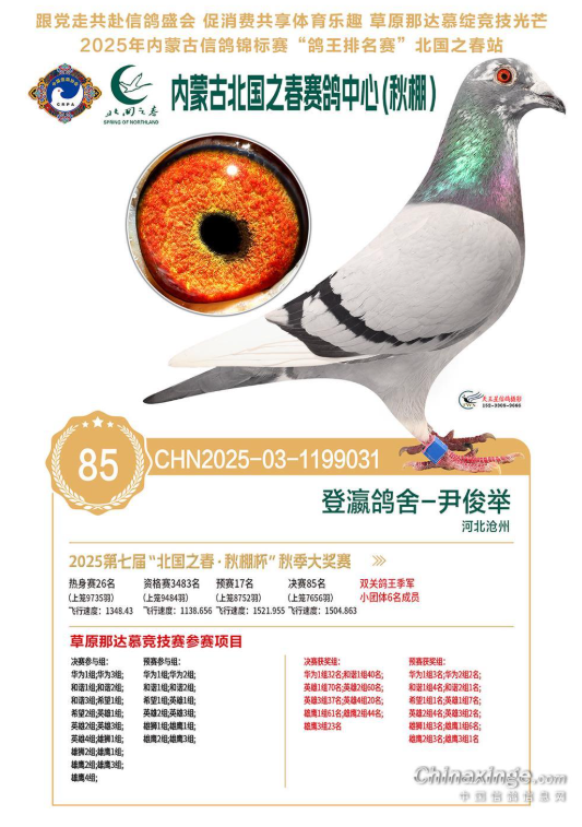 一连数日来,全国秋赛热潮涌动,各地公棚齐鸣战鼓,数十万羽精英昂首踏上秋赛征途。一个属于赛鸽人的丰收季,已悄然开启!赛场之上,神鸟频现,名家强豪齐聚一线,竞逐冠军宝座。其中,登瀛鸽舍-尹俊举以精兵策略,在各地秋赛中多点开花,佳绩连连。