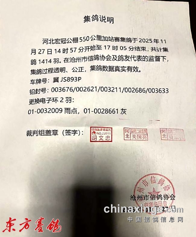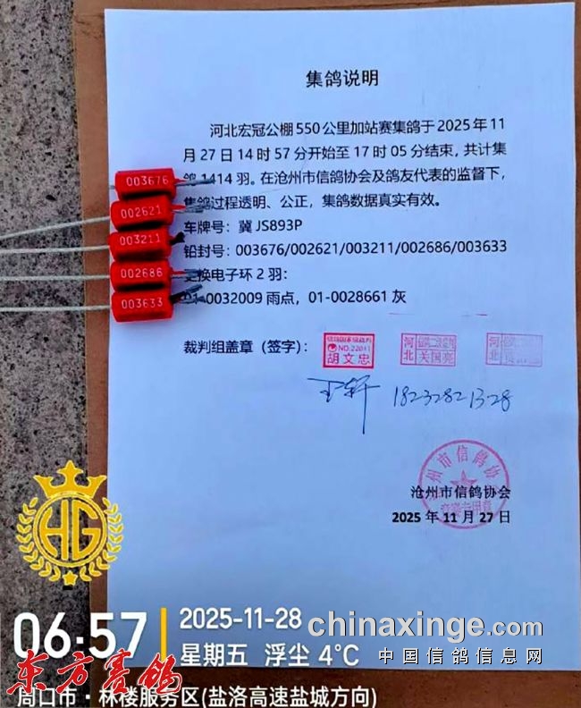 今天是个好日子。河北宏冠公棚继取得秋季三关赛圆满成功之后,今天又传捷报:550公里加站赛取得当日归巢857羽,当日归巢率为60.61%!加站赛圆满成功,为本年秋赛锦上添花,写就一个赛季的传奇。