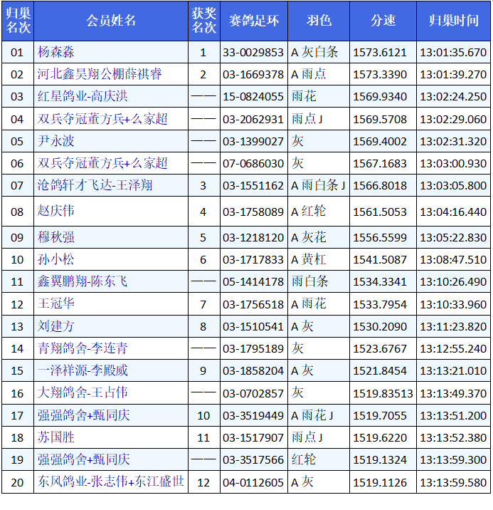 河北雄安杨森淼麾下33-0029853灰白条摘取桂冠,分速高达1573.6121米。